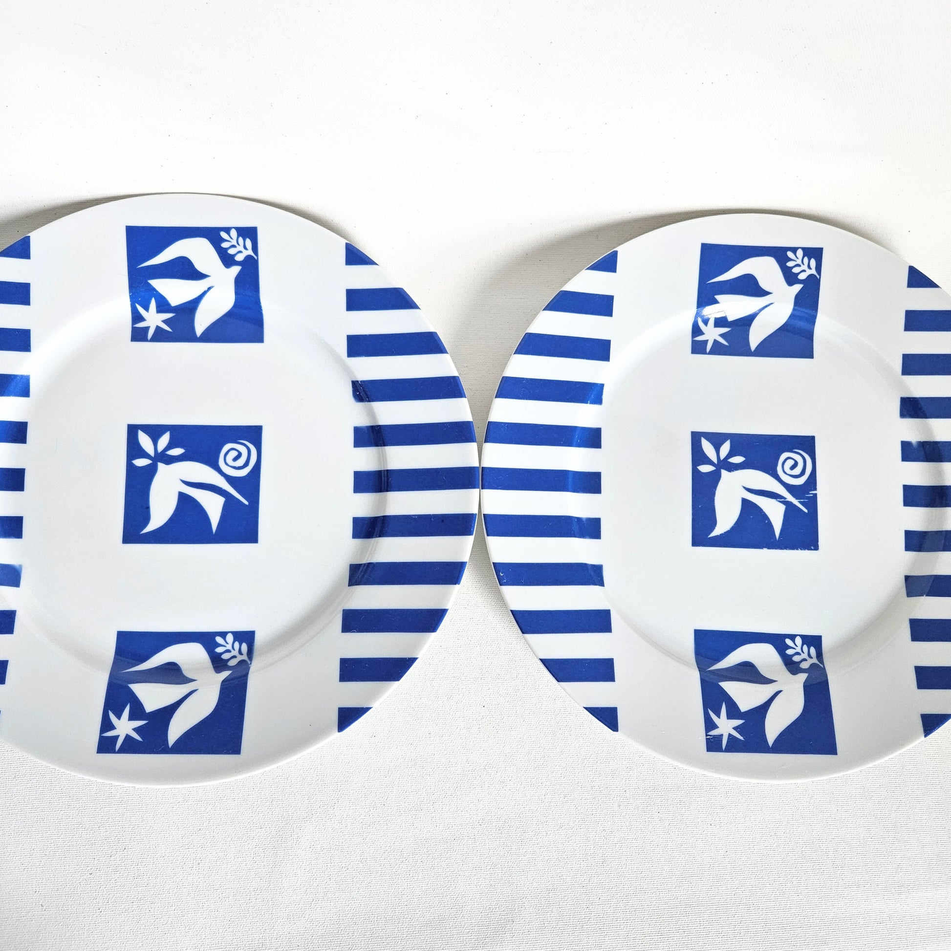 ensemble de 2 grandes assiettes à dîner en céramique blanc/bleu - illustration de Matisse, collection vintage Ikea, faite par Spal au Portugal