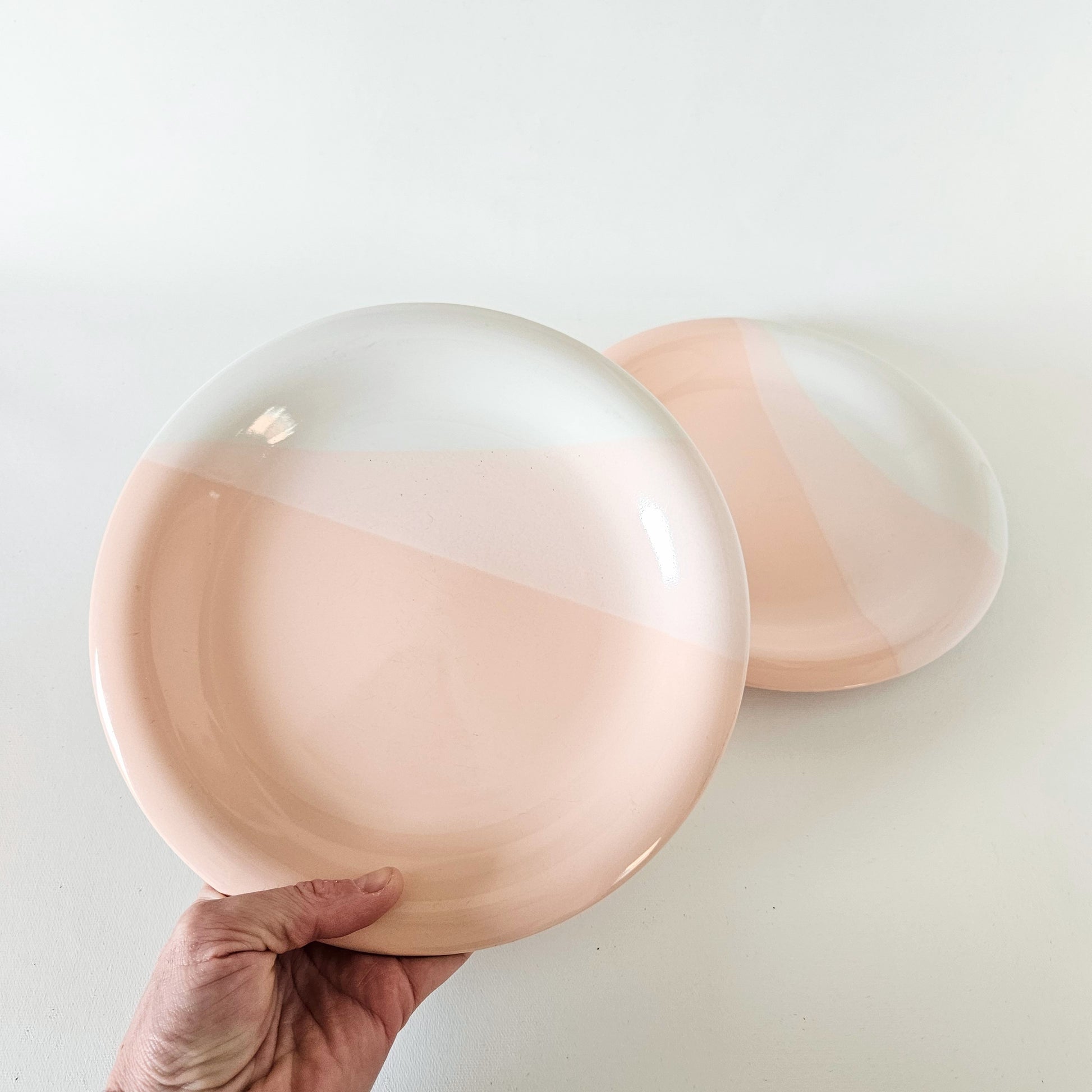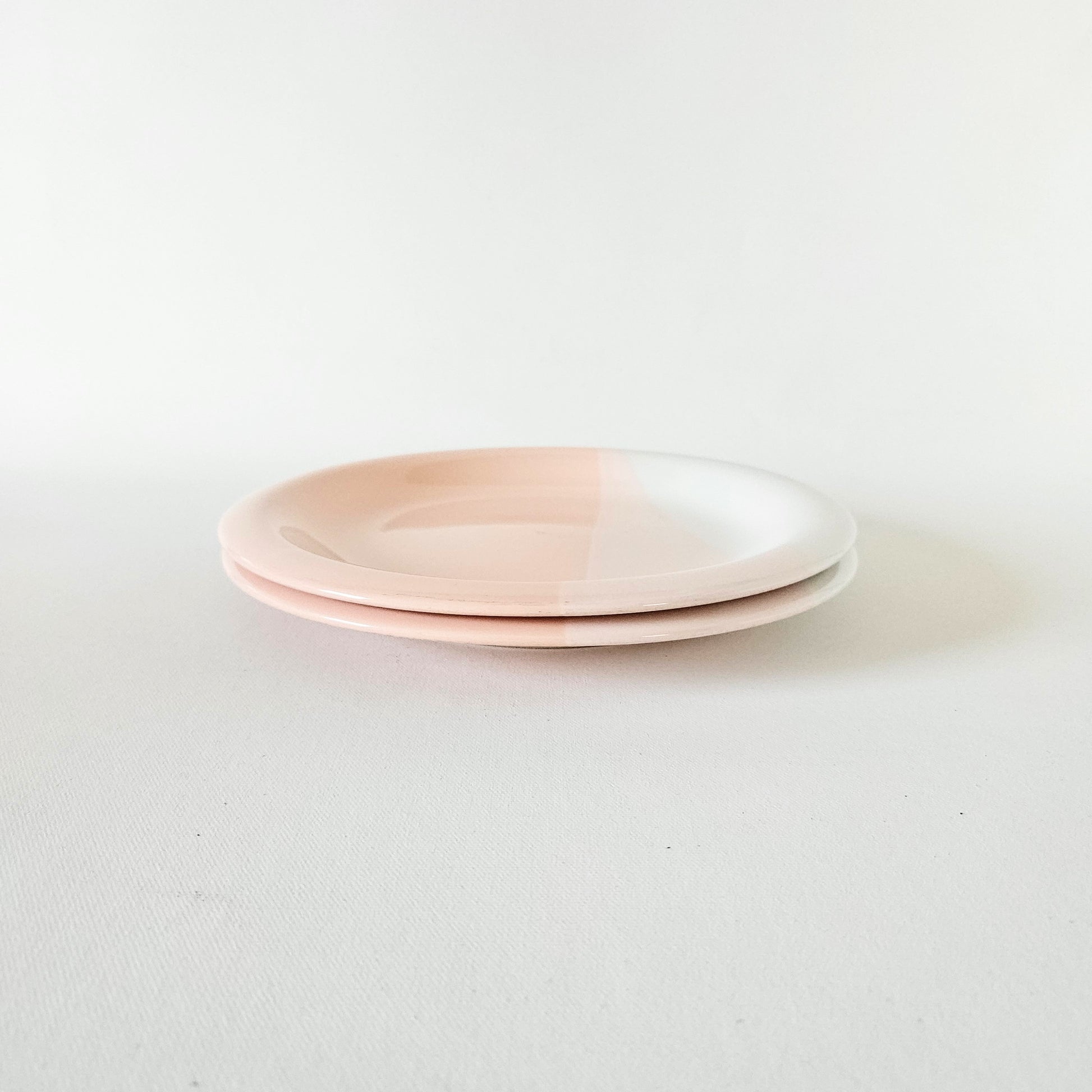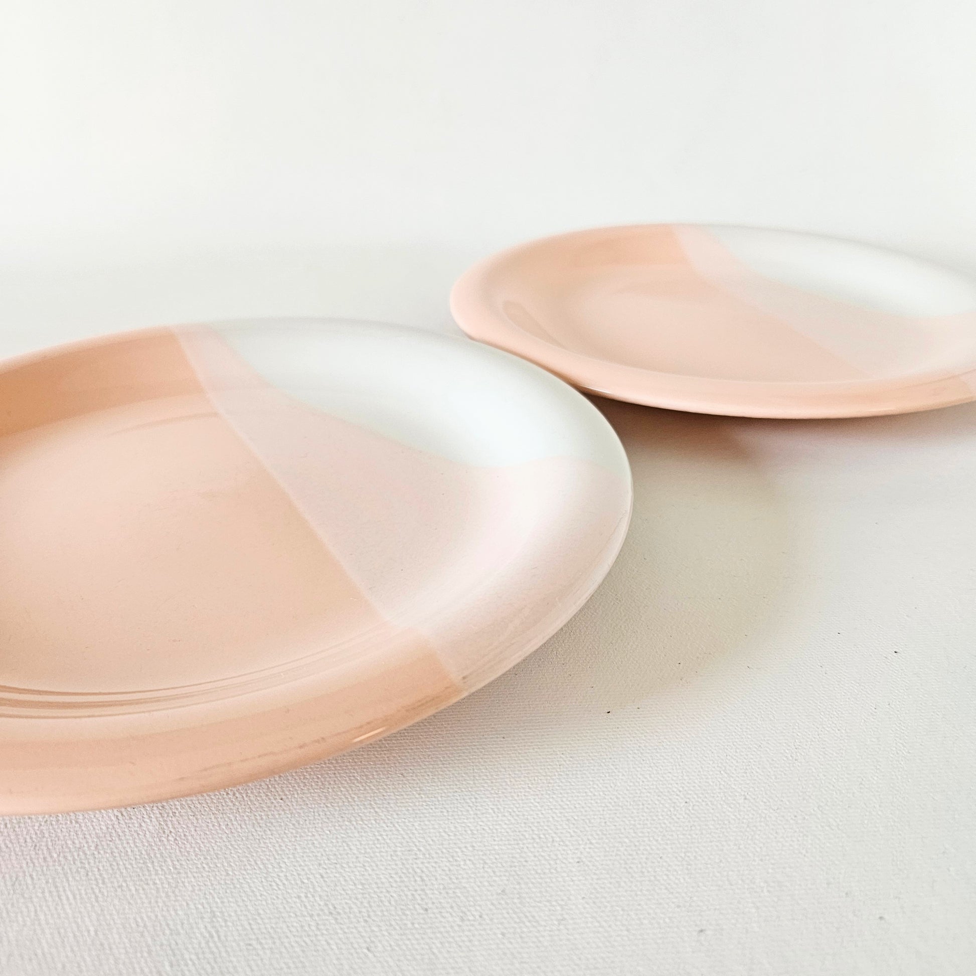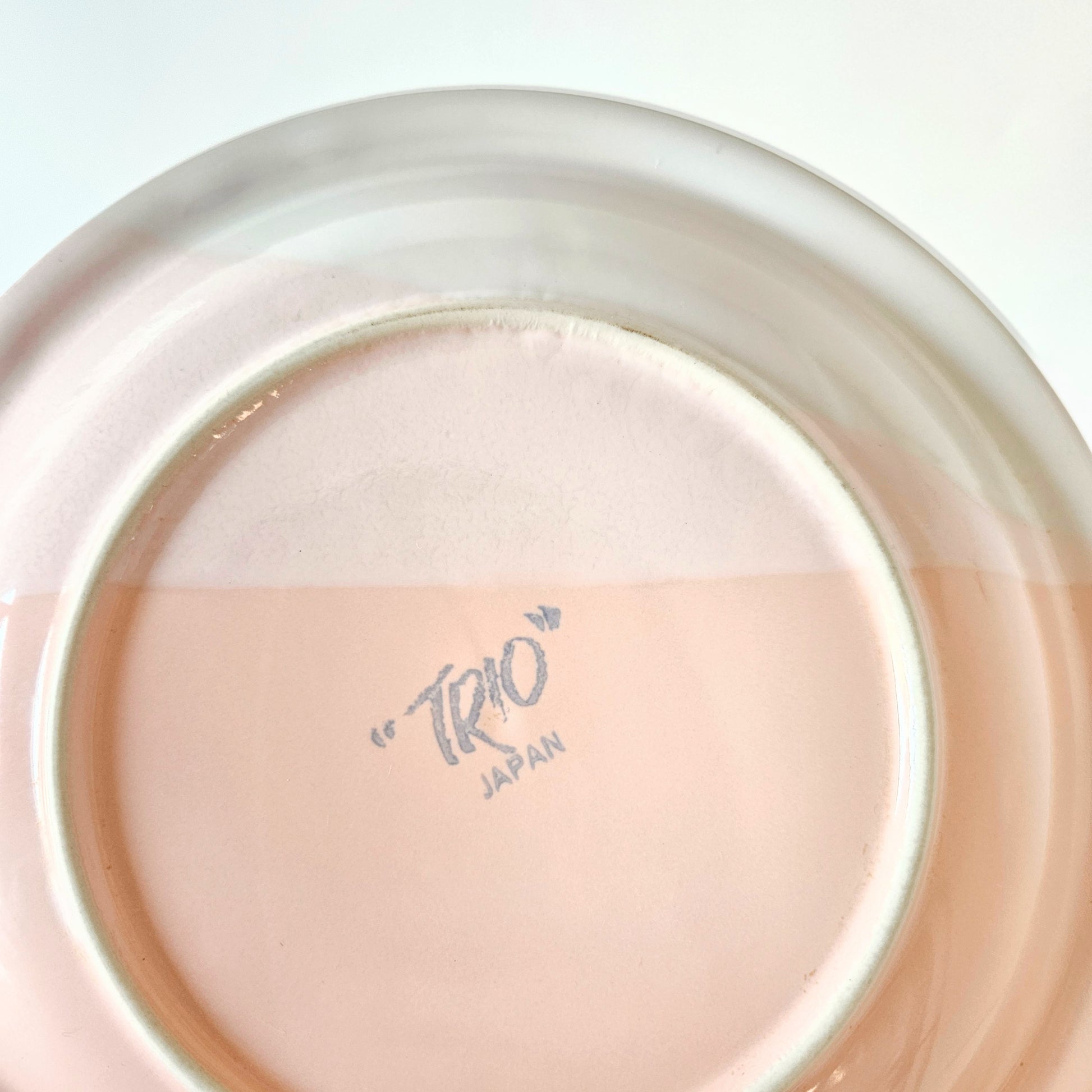 ensemble de 2 assiettes à dîner en céramique tricolore blanc, beige roisé et rose pêche pastel, signé Trio (Mikasa), faites au Japon