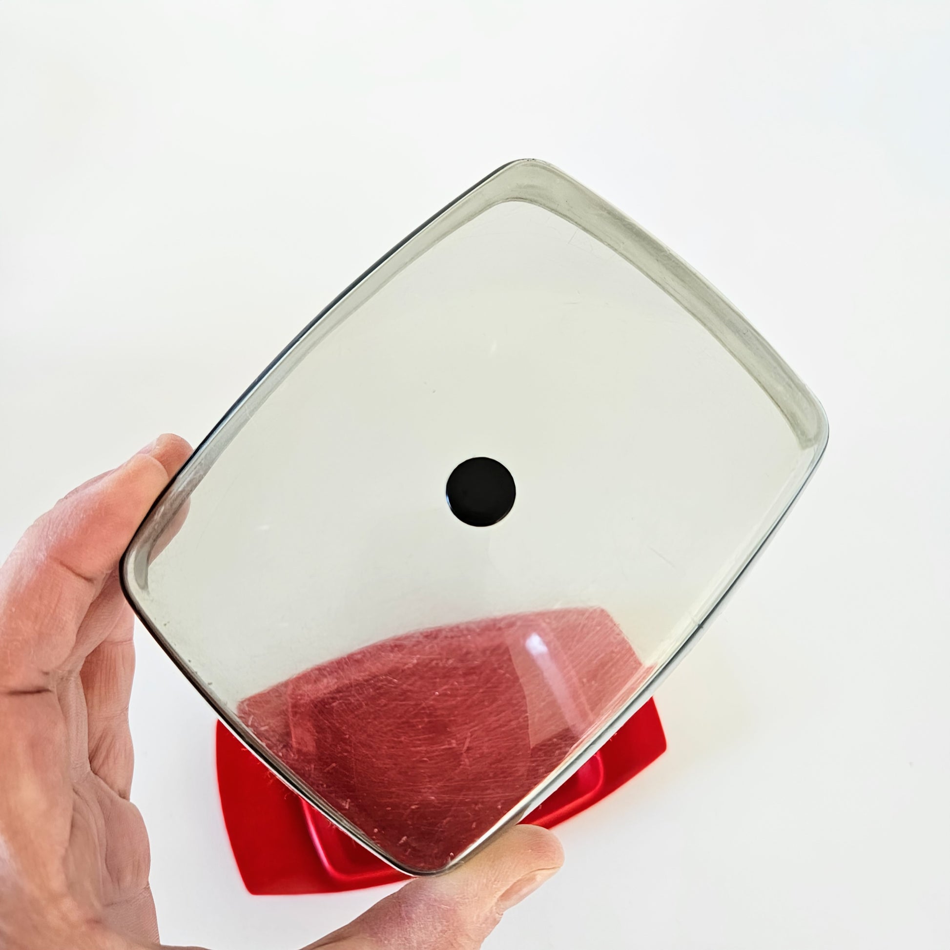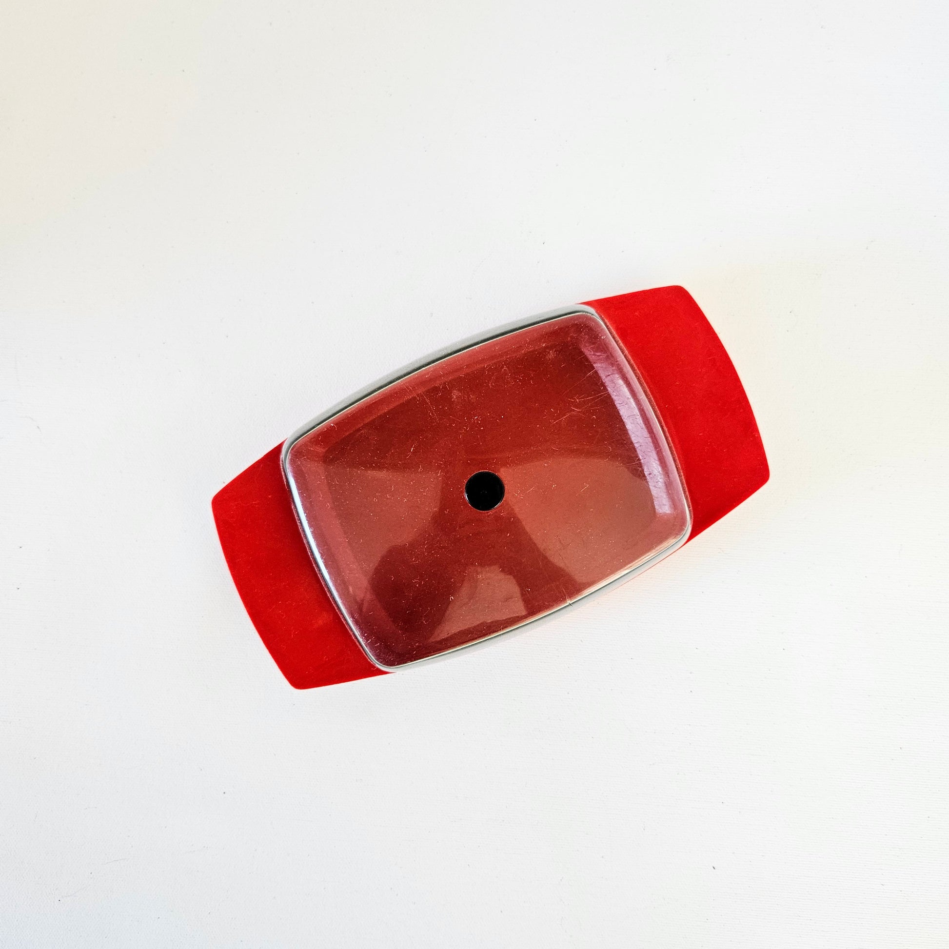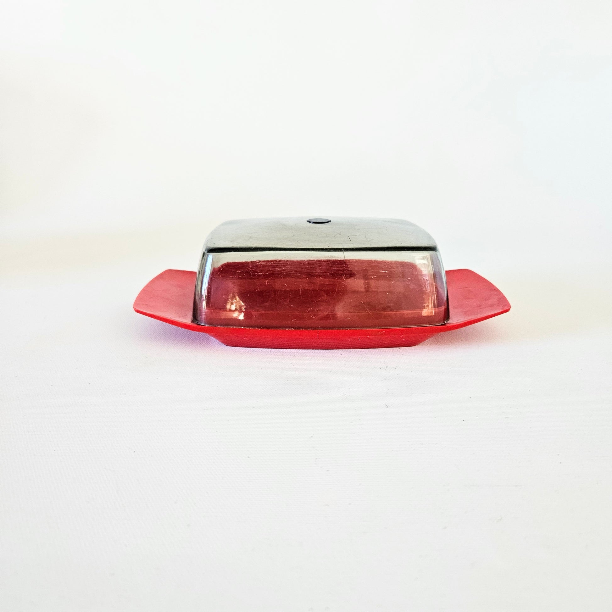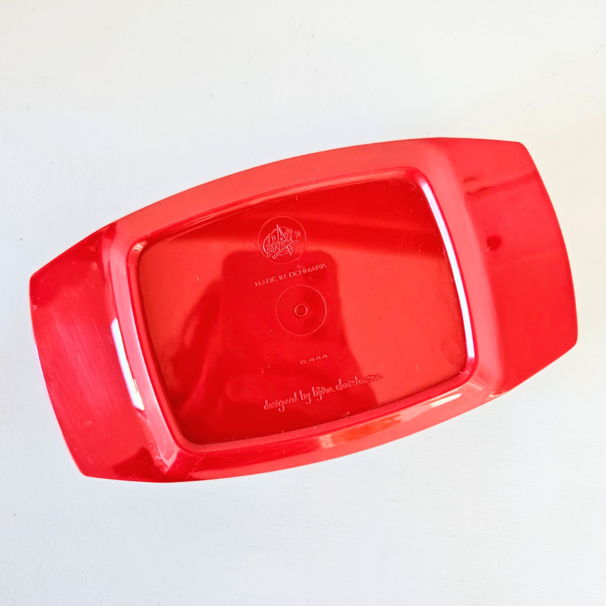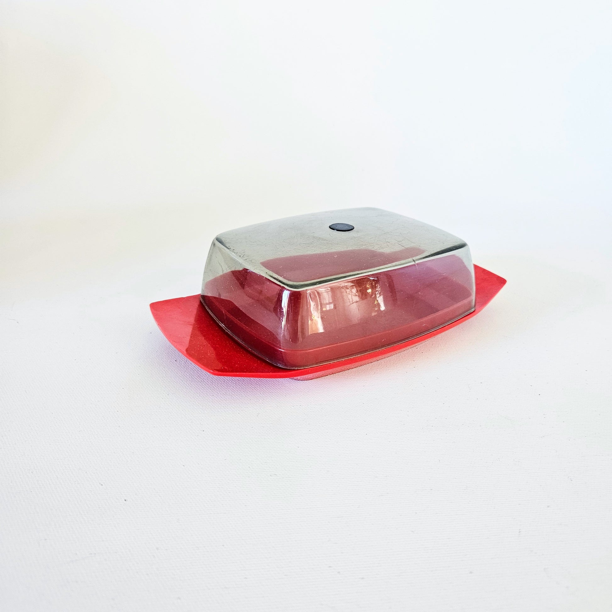 beurrier en plastique rouge et transparent fumé, signé Rösti, design par Bjorn Christensen, fait au Danemark