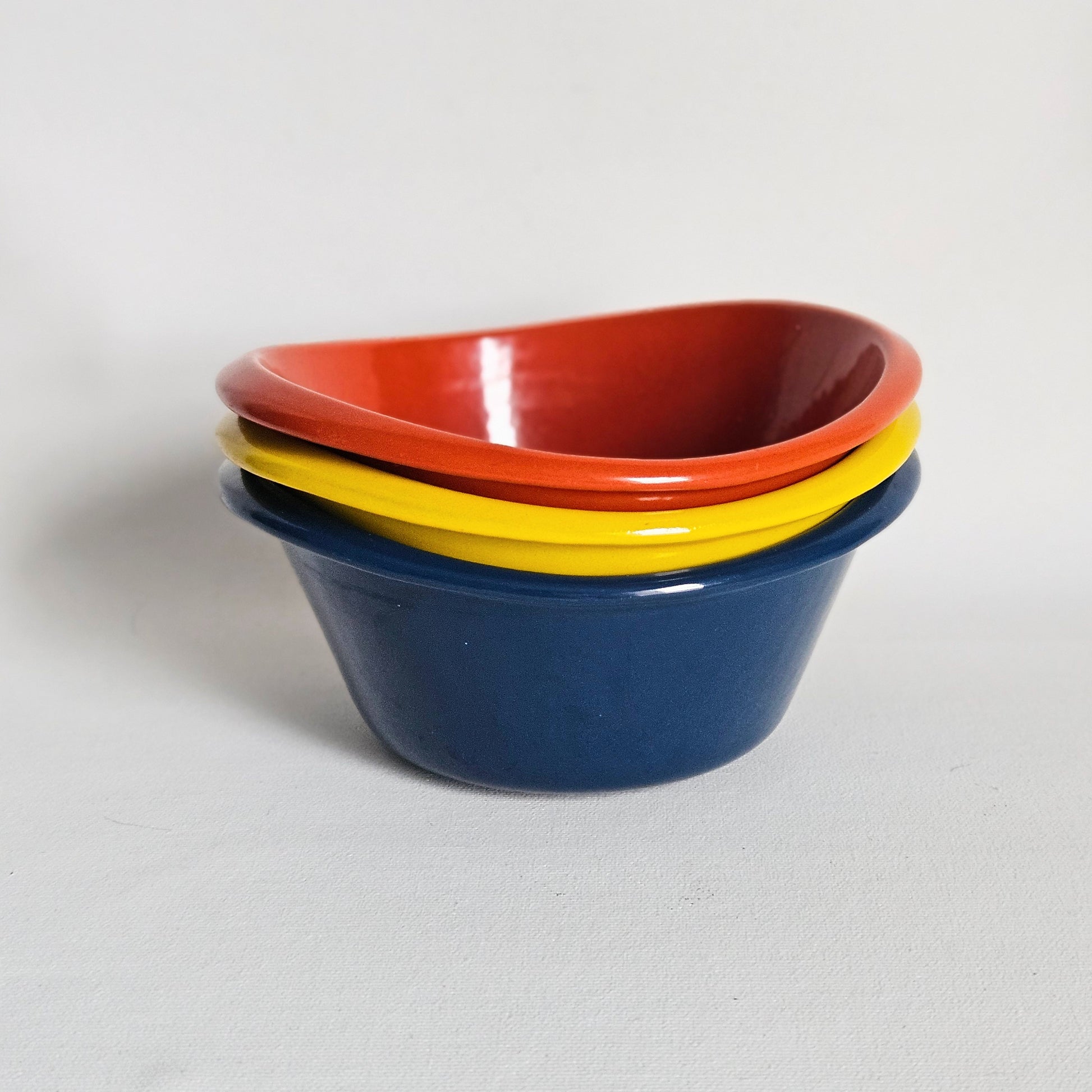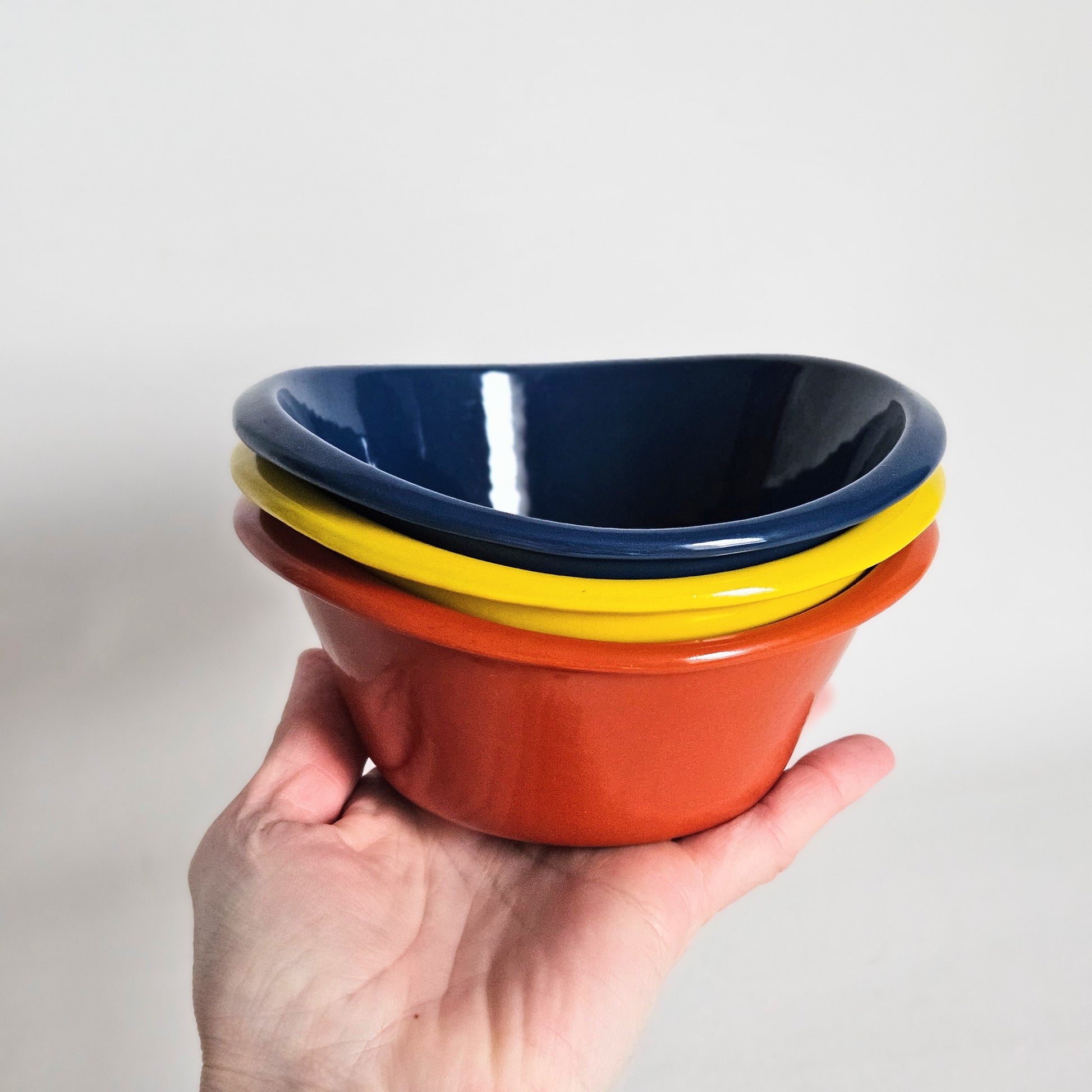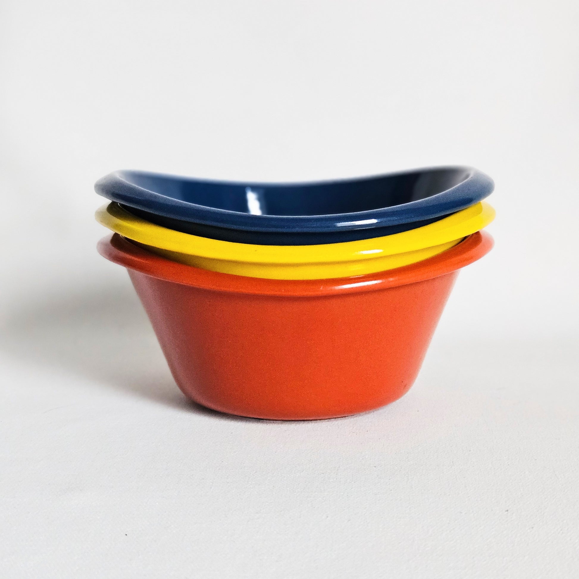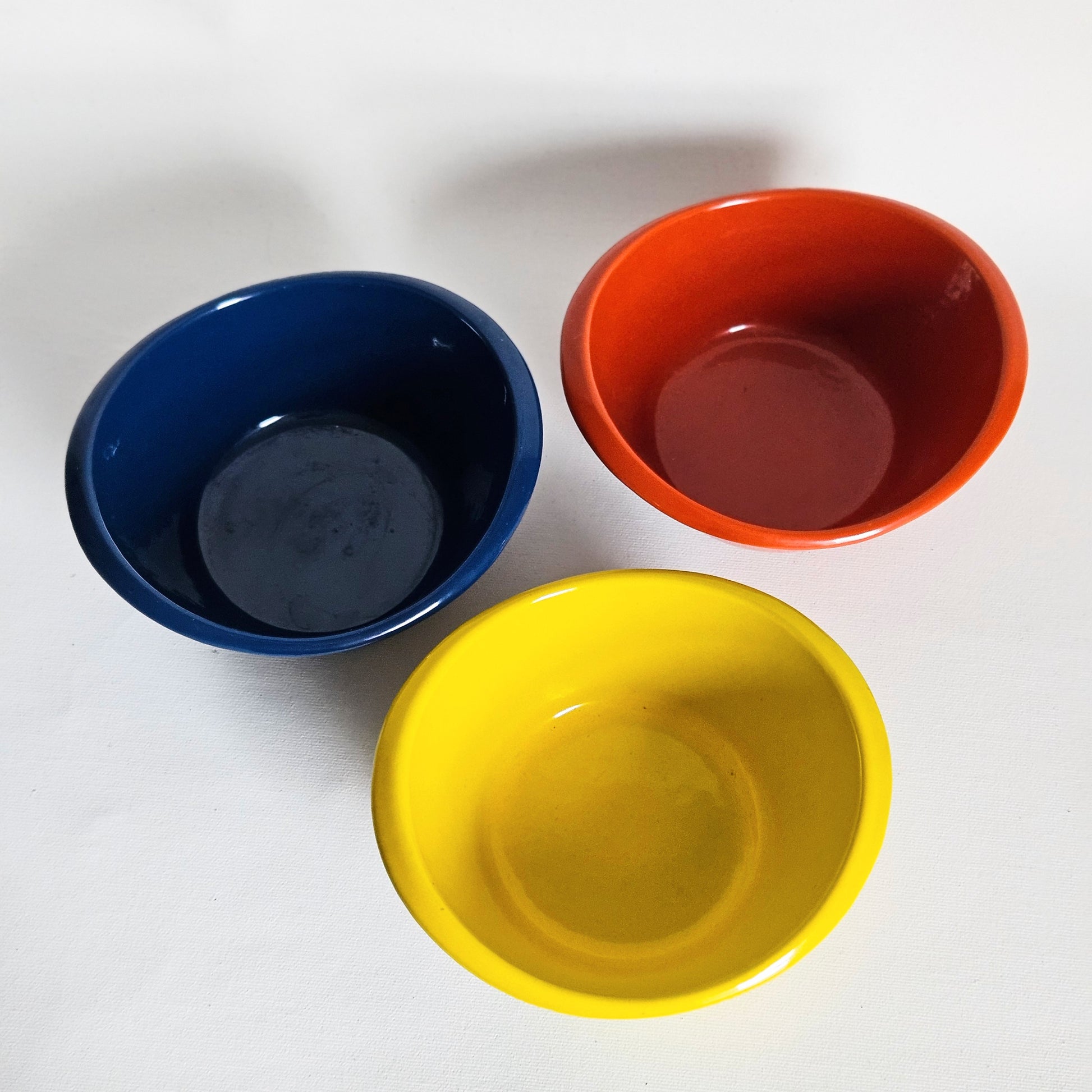 rares bols vintage en fonte émaillée (pesant) de 3 couleurs différentes, signé Copco, fait au Danemark.