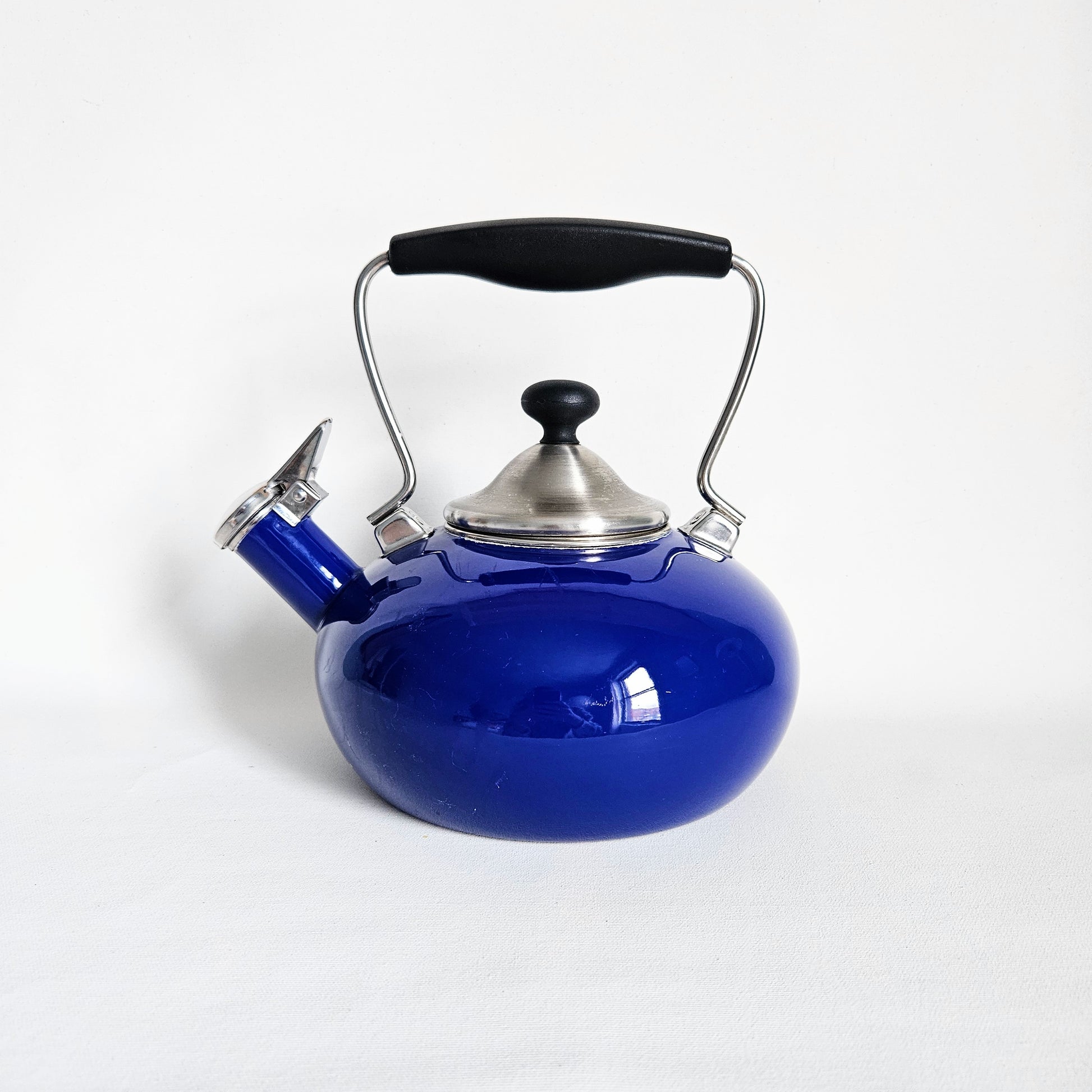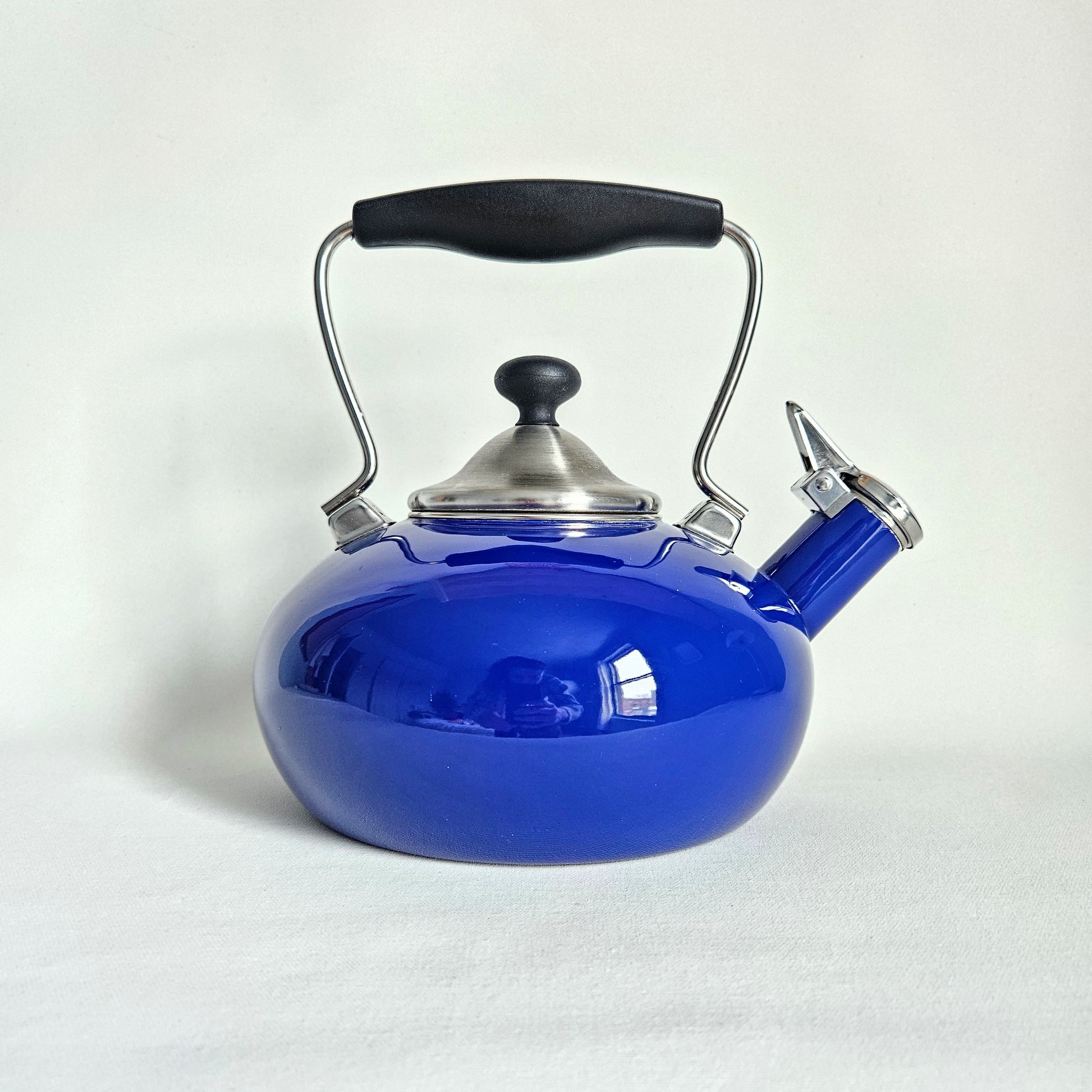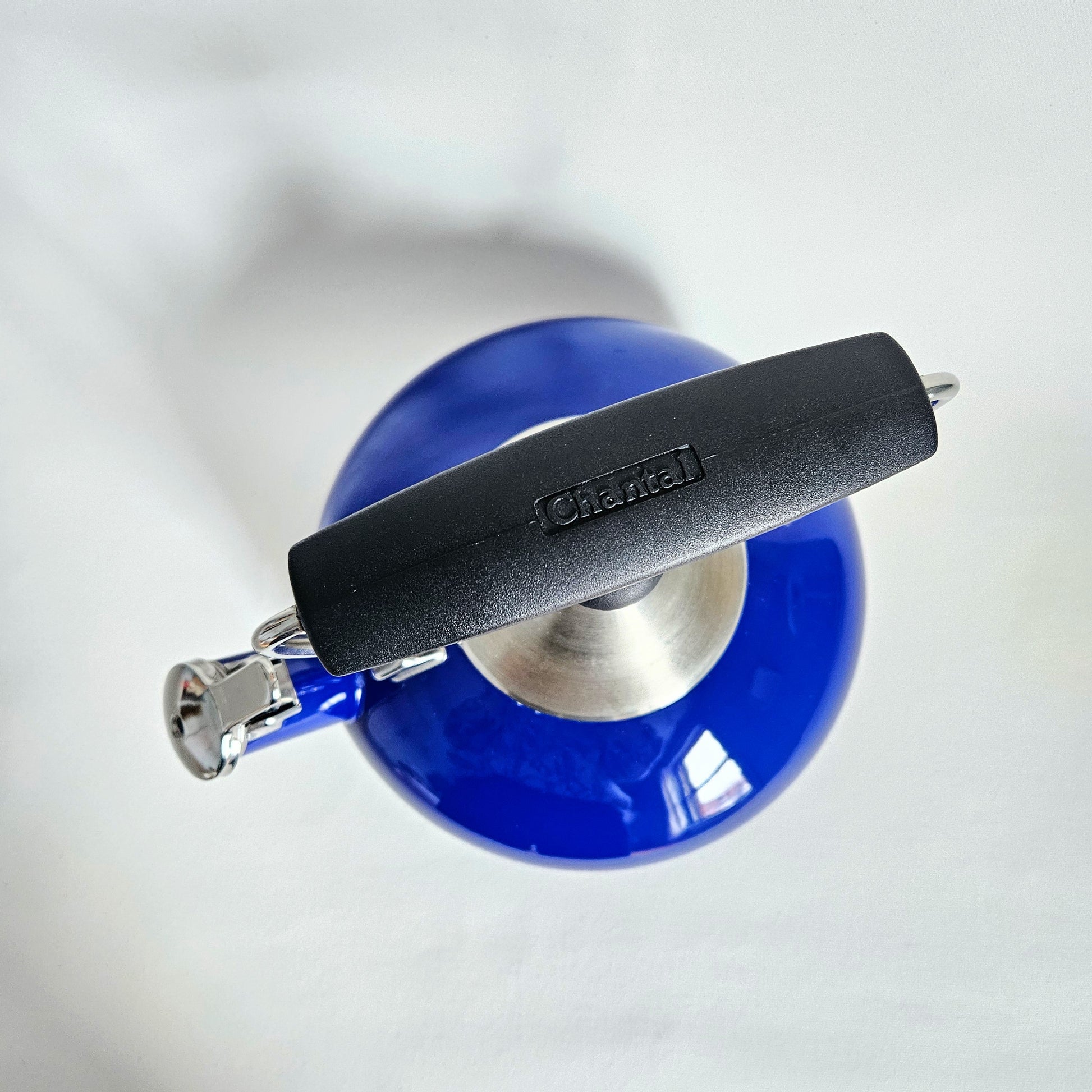 bouilloire sifflante en métal émaillé bleu outremer, de la marque Chantal