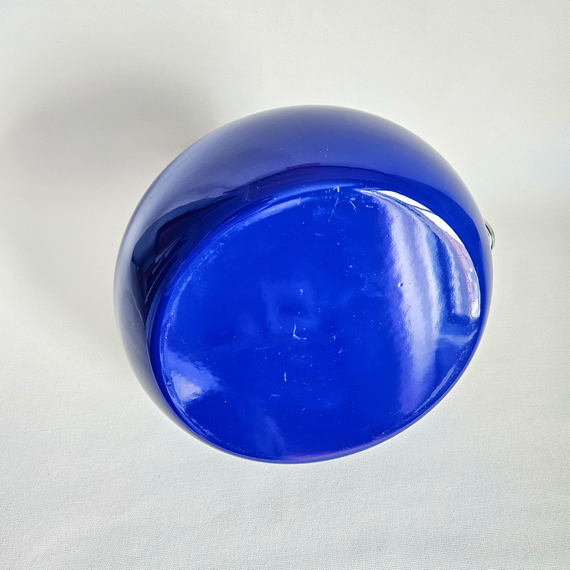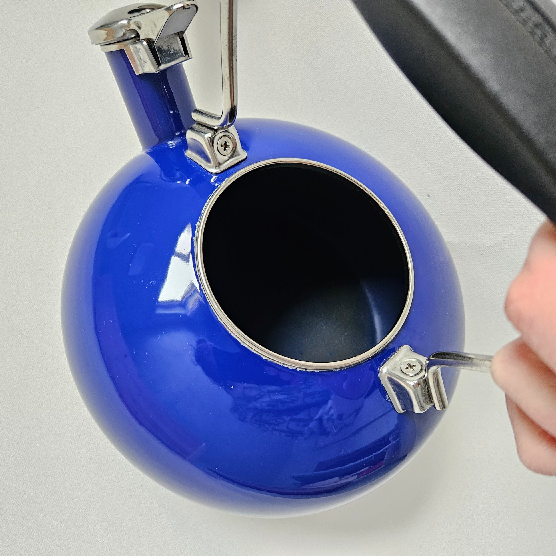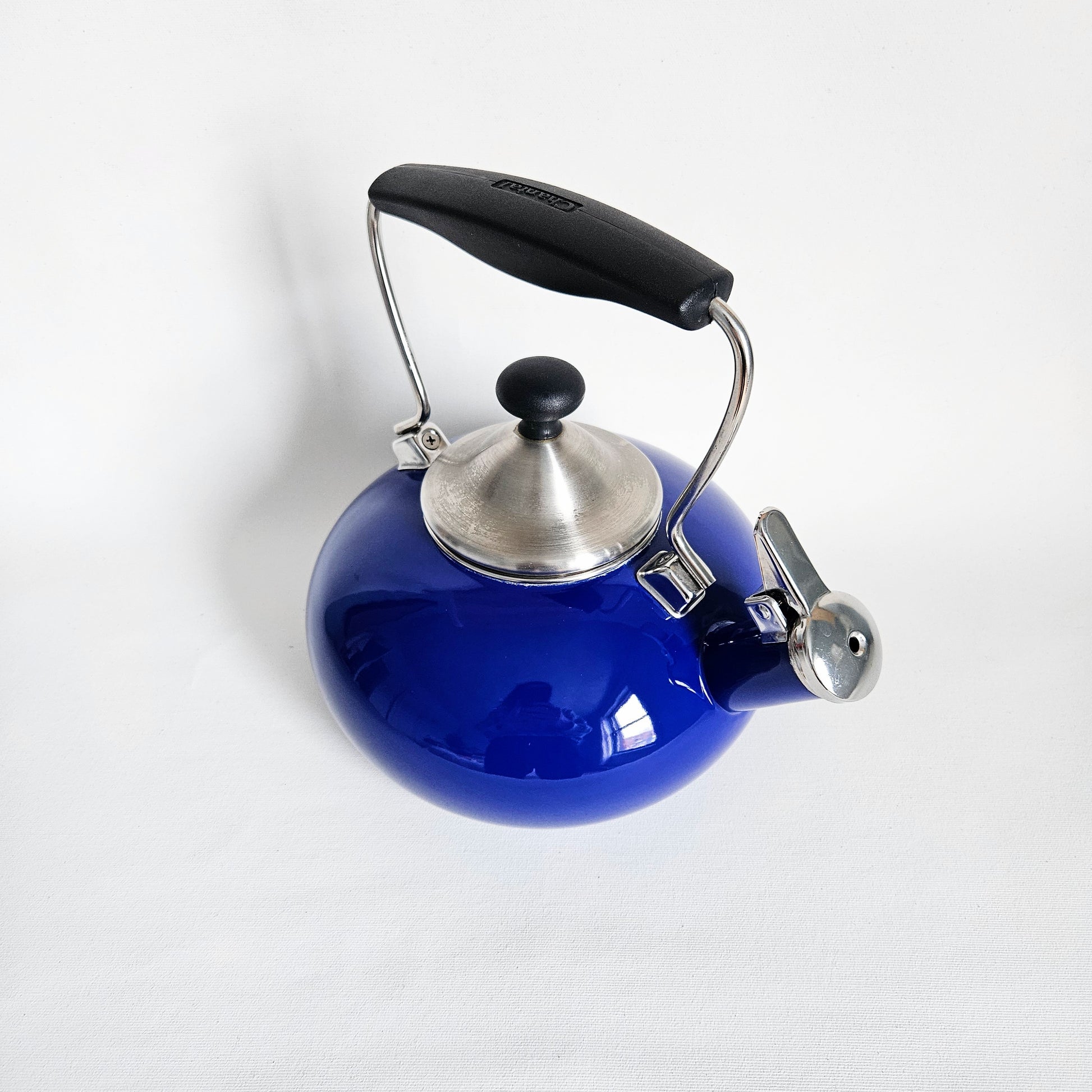 bouilloire sifflante en métal émaillé bleu outremer, de la marque Chantal