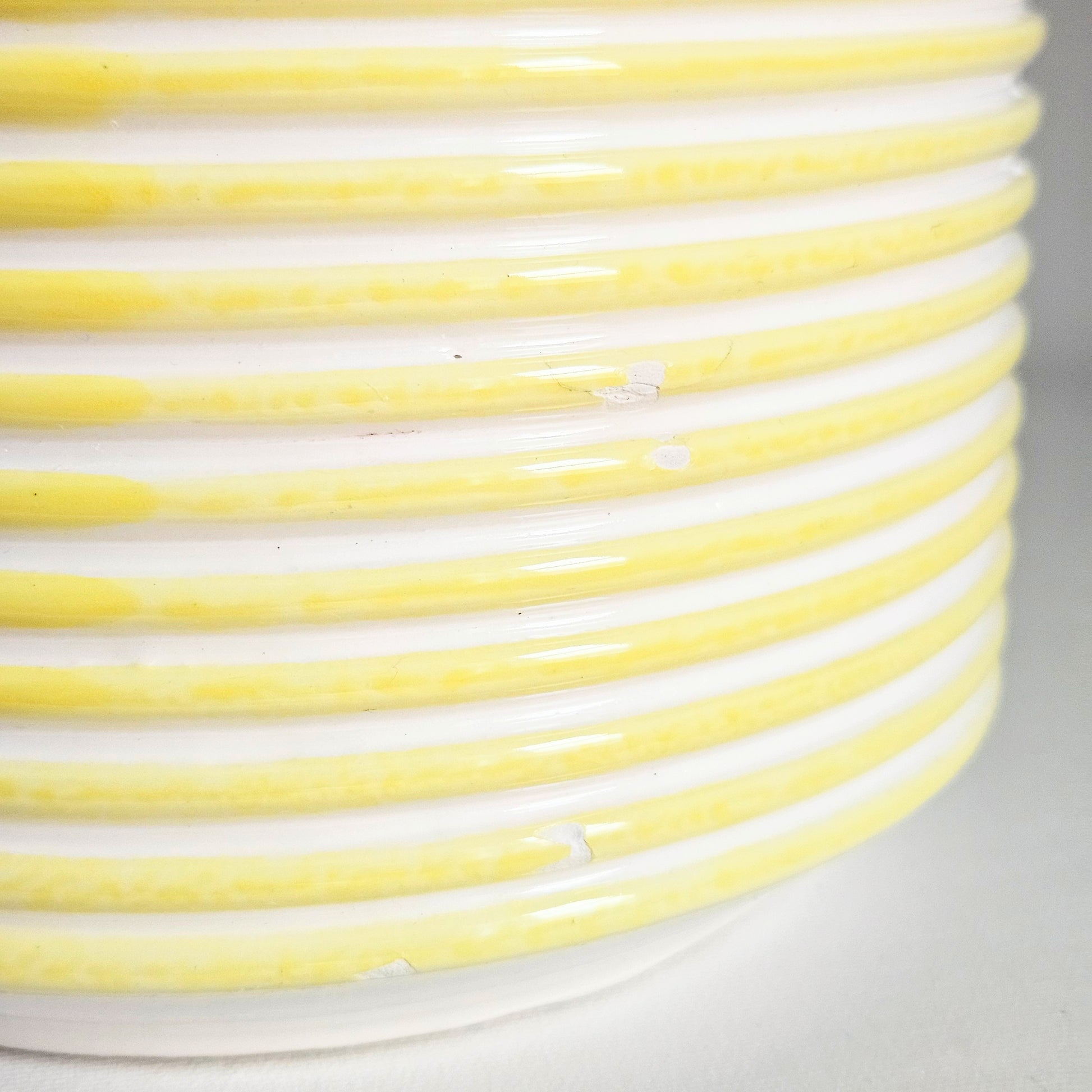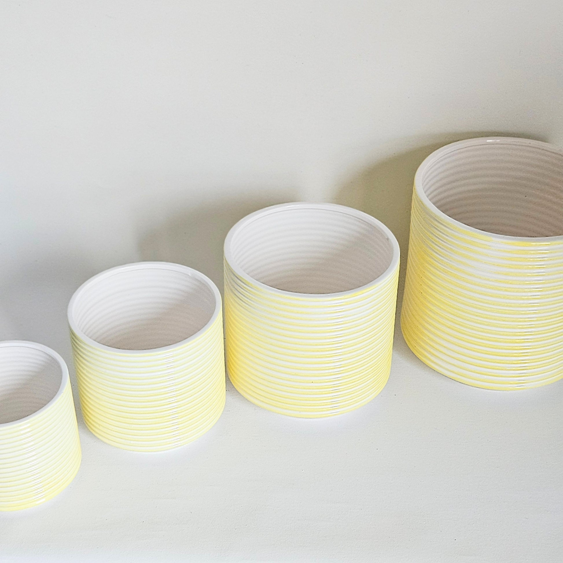 ensemble de 4 cache-pots vintage en céramique à fines rayures horizontales jaune et blanc, faits au Japon