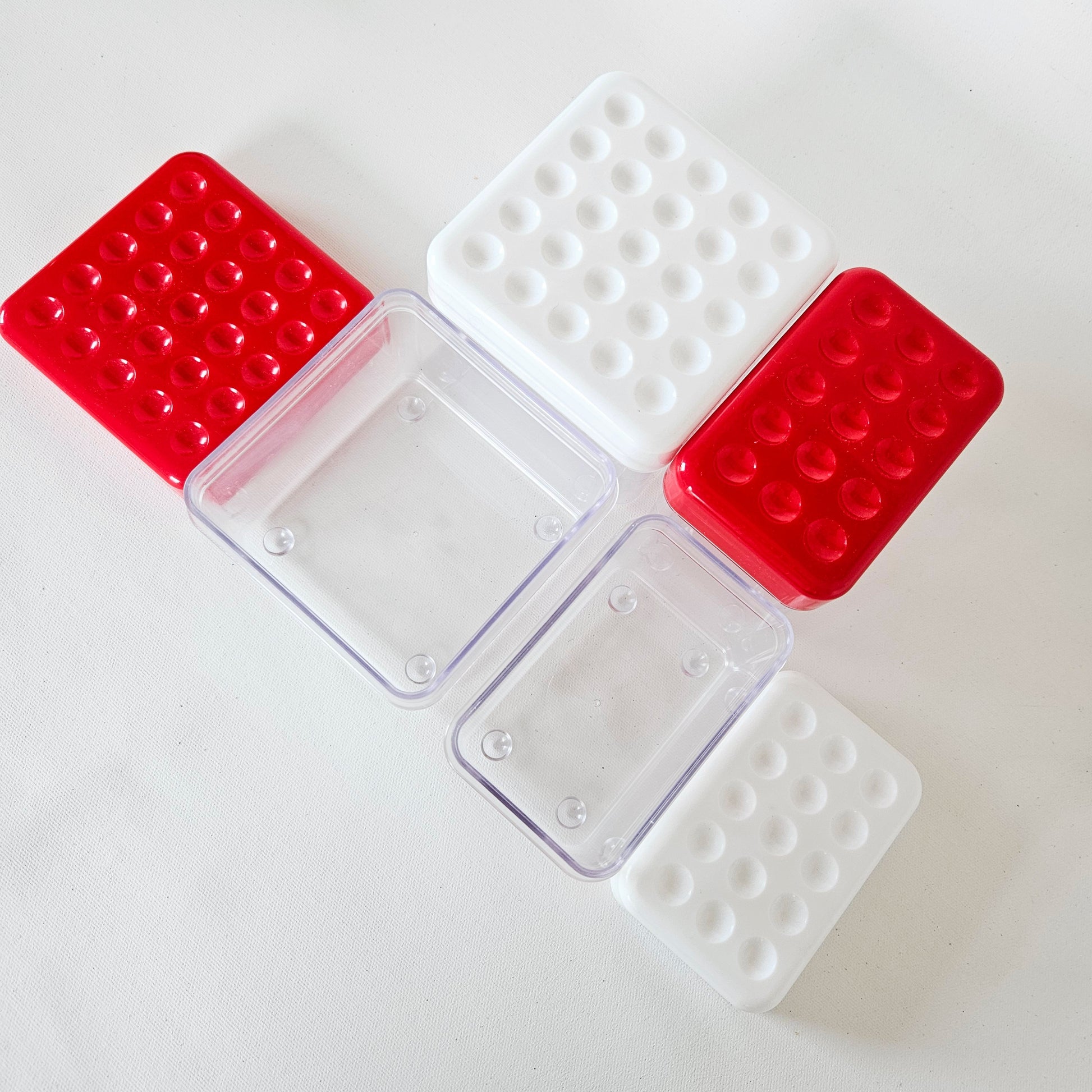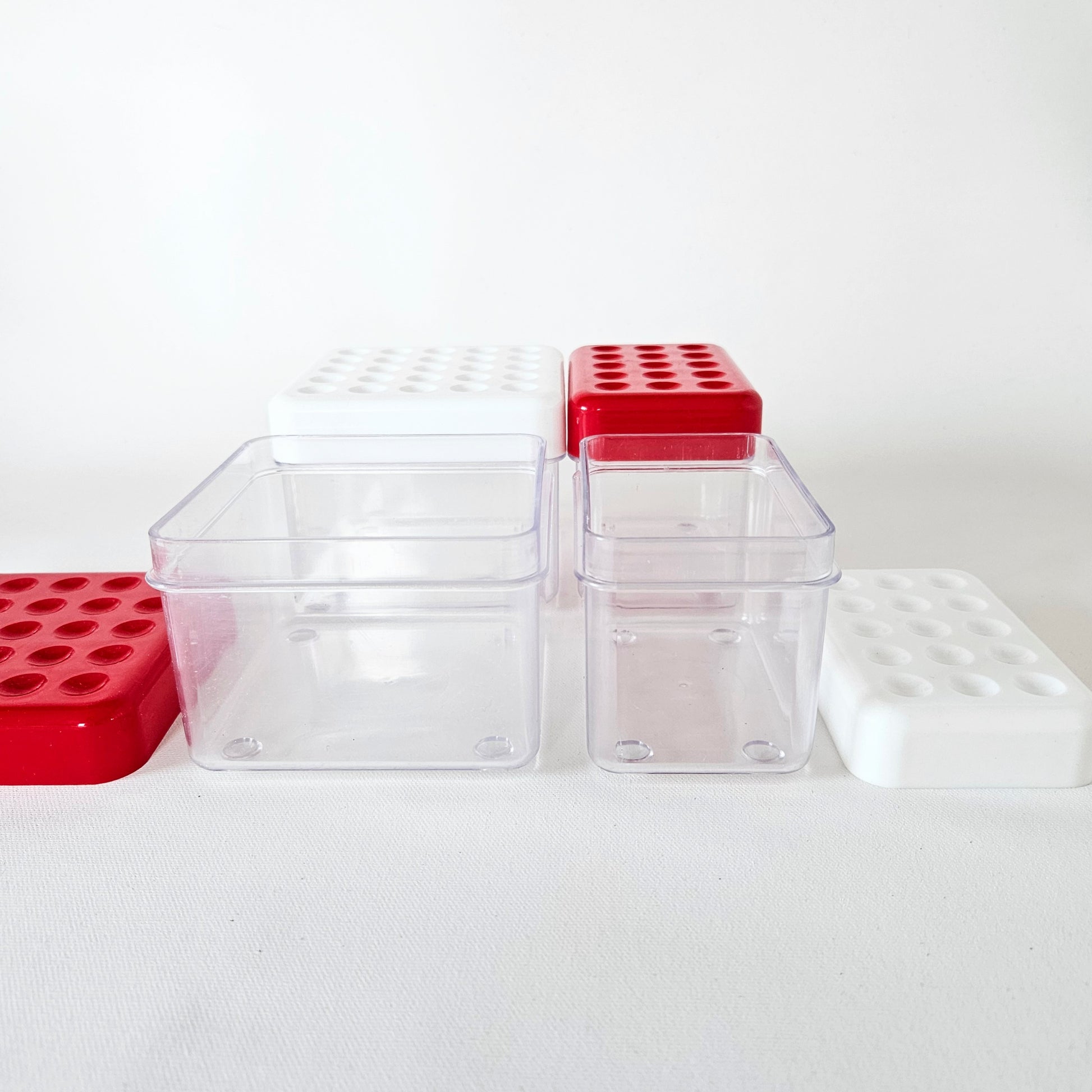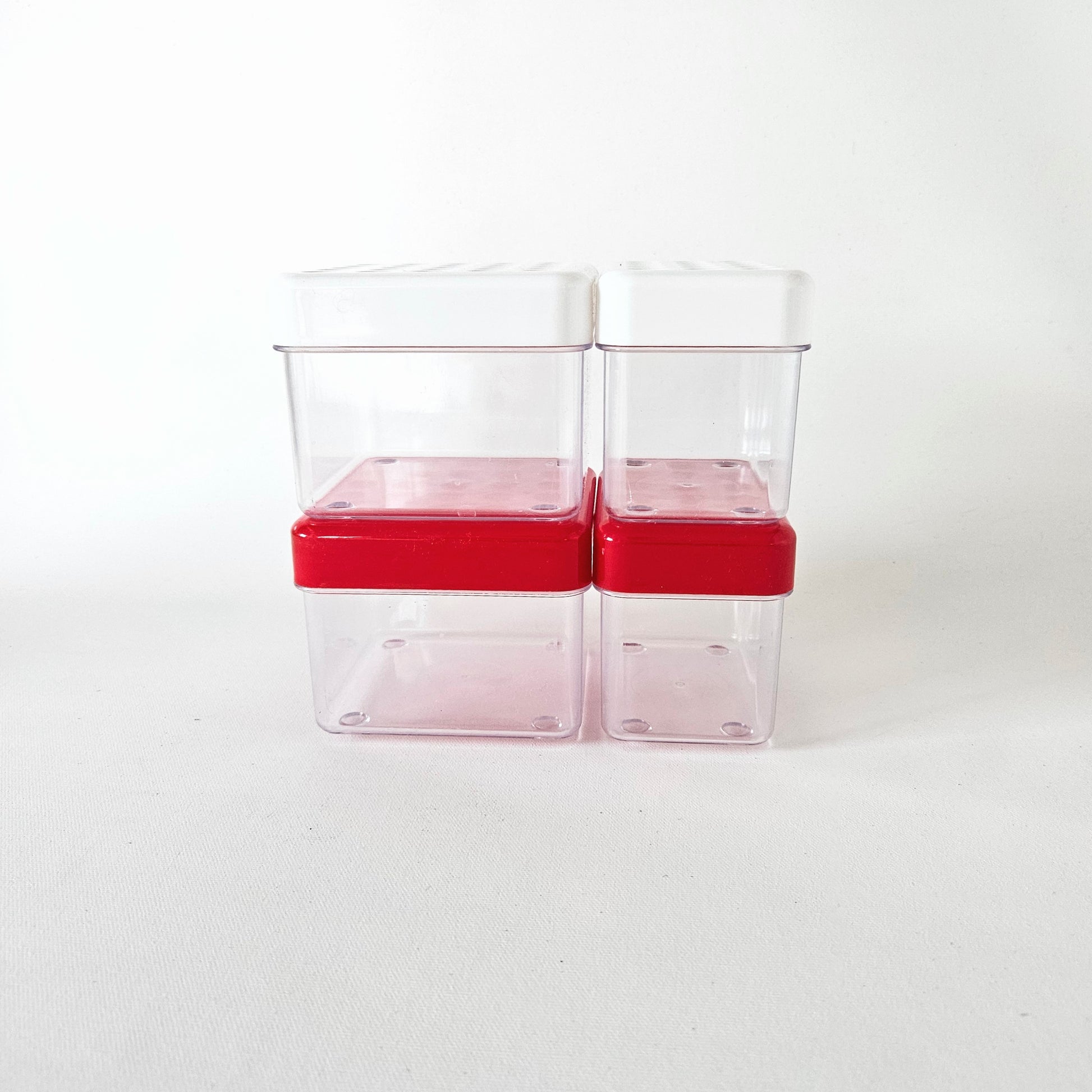 ensemble vintage de 2 boîtes contenants en plastique acrylique transparent et mélamine rouge ou blanc, empilables
