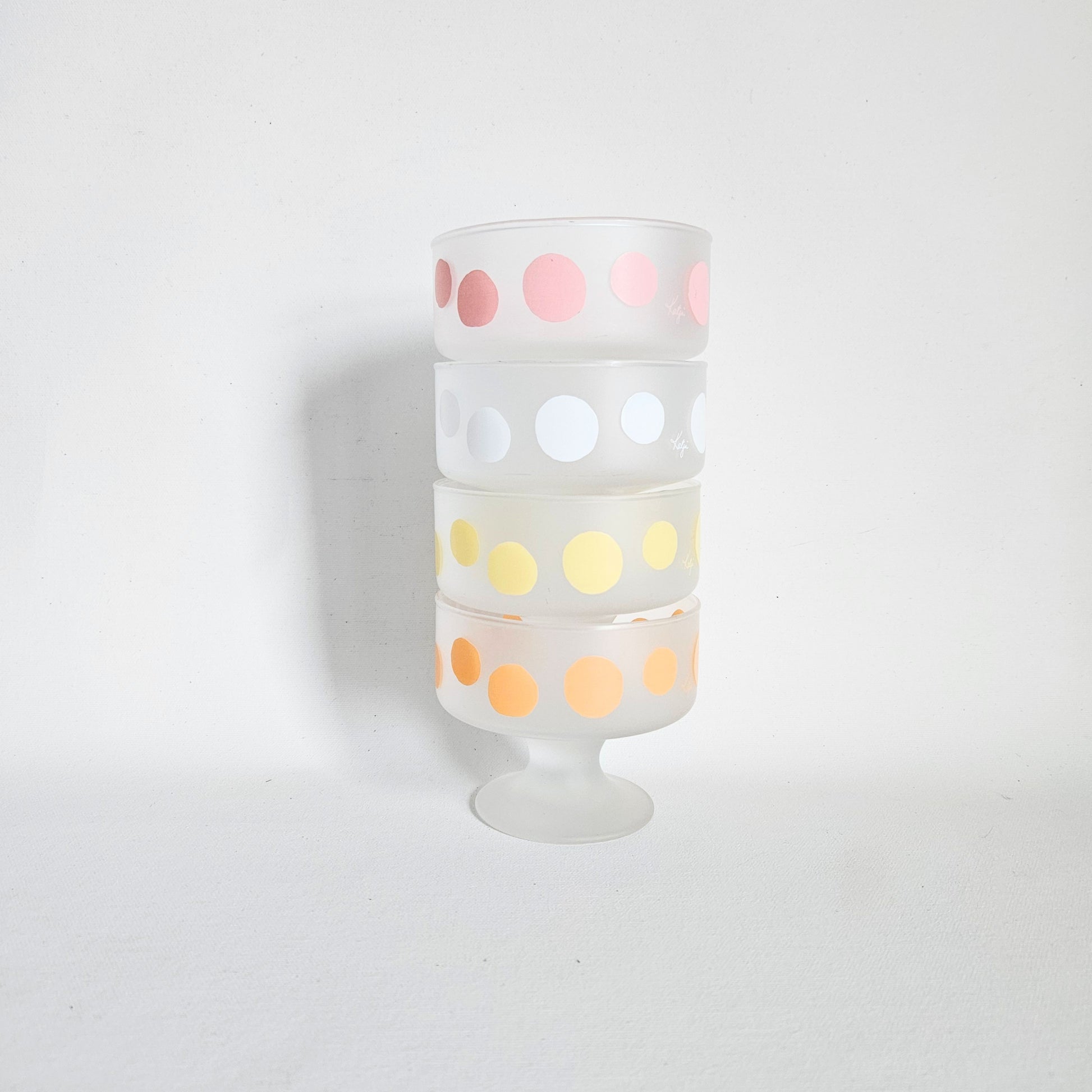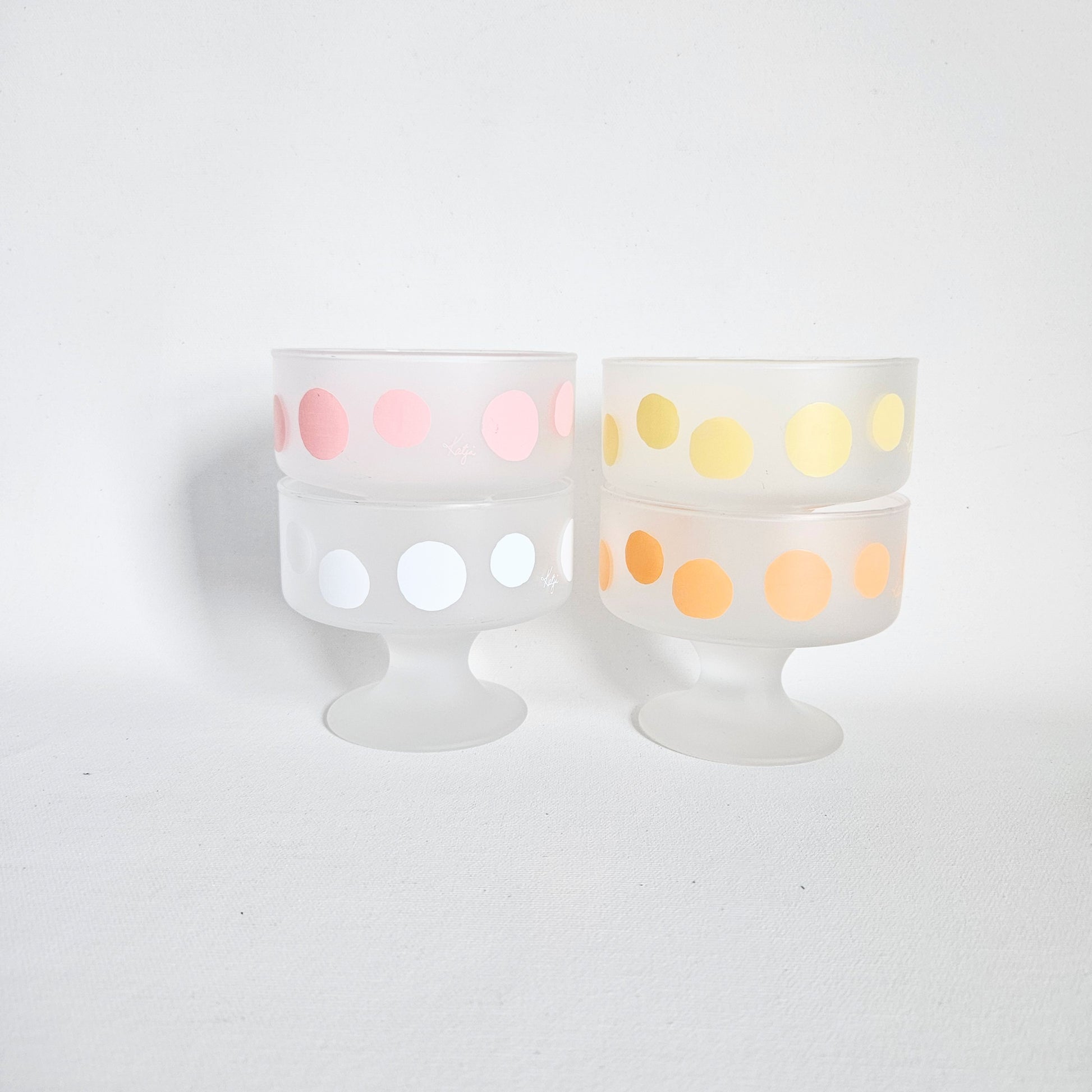 ensemble de 4 coupes à dessert en verre clair givré avec motif de pois multicolore pastel, signé Katja, Sasaki, faites au Japon