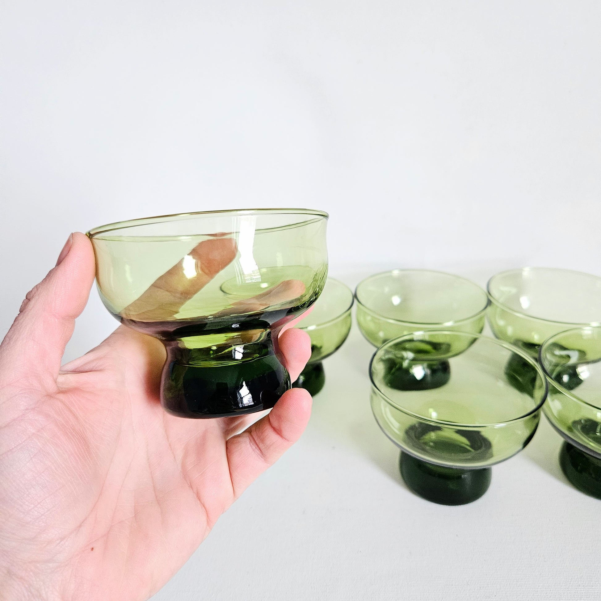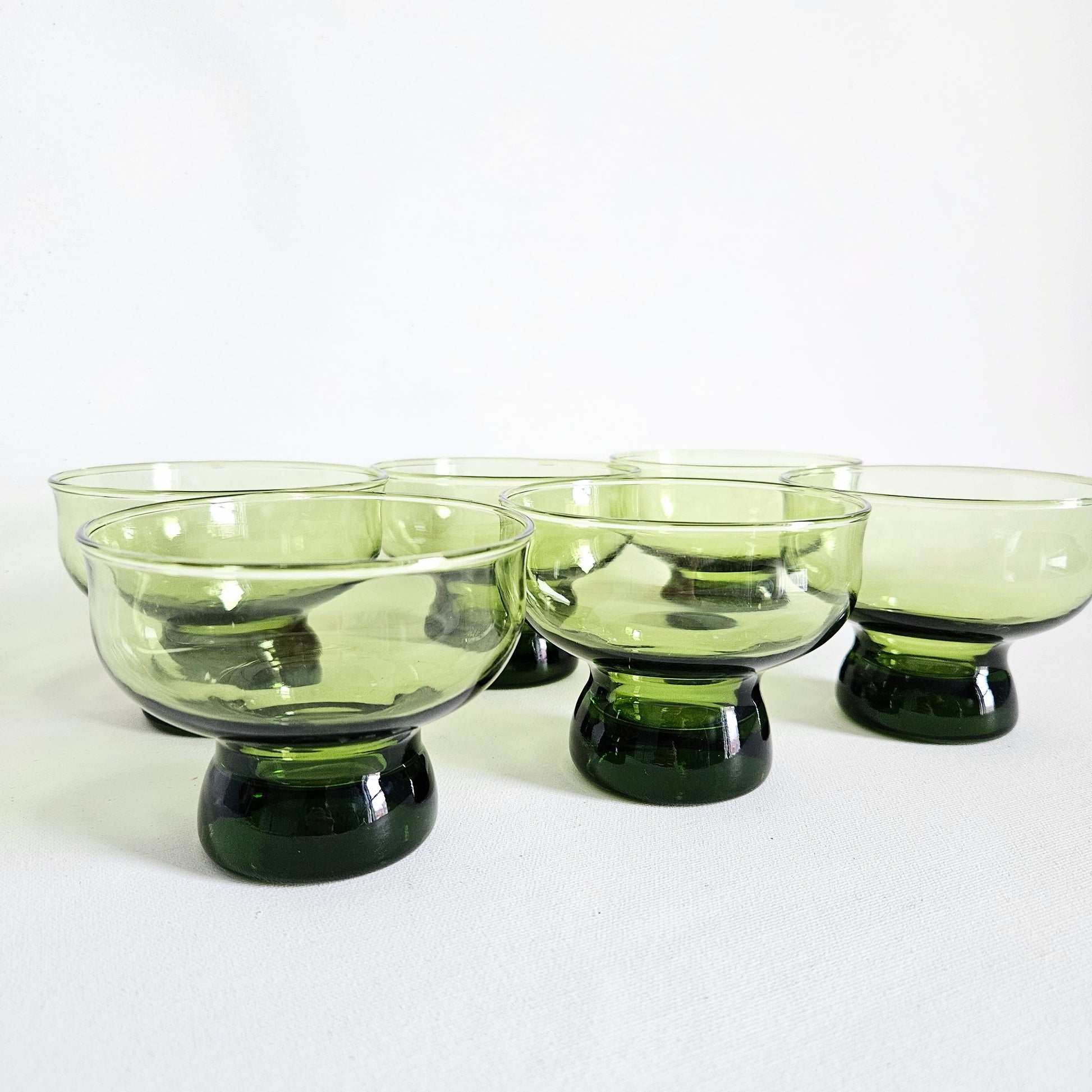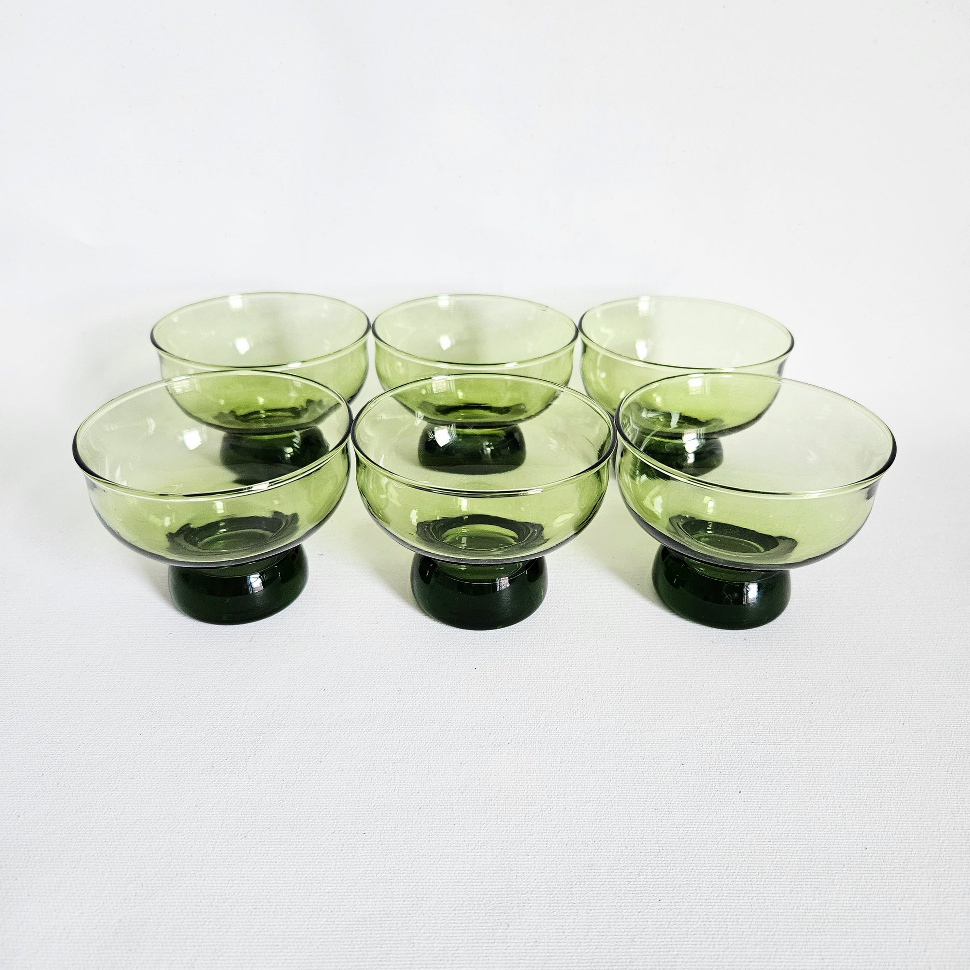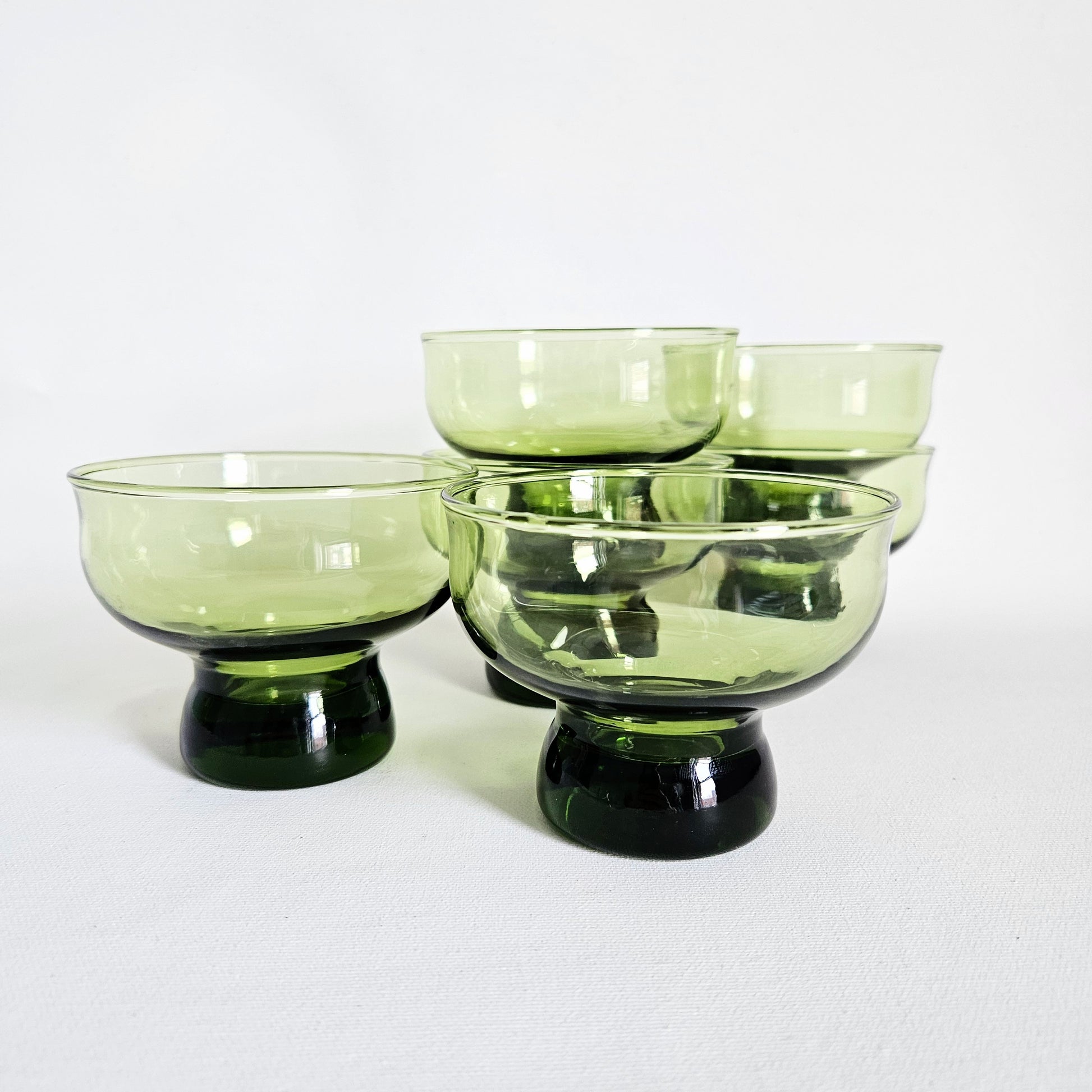 ensemble de 6 coupes à dessert vintage 1970s en verre vert avocat, Anchor Hocking, faits aux USA