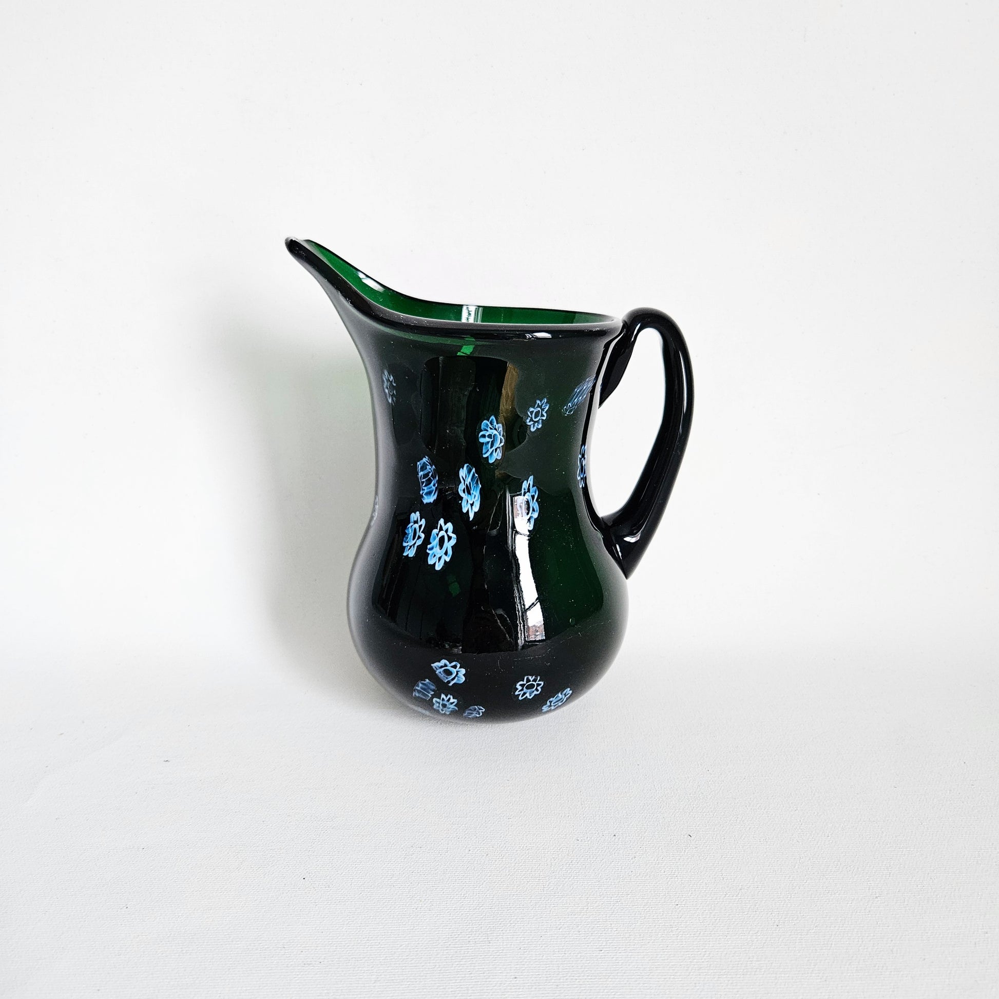 petit pichet en verre soufflé artisanal vert forêt à motif de style 'millefiori' blanc