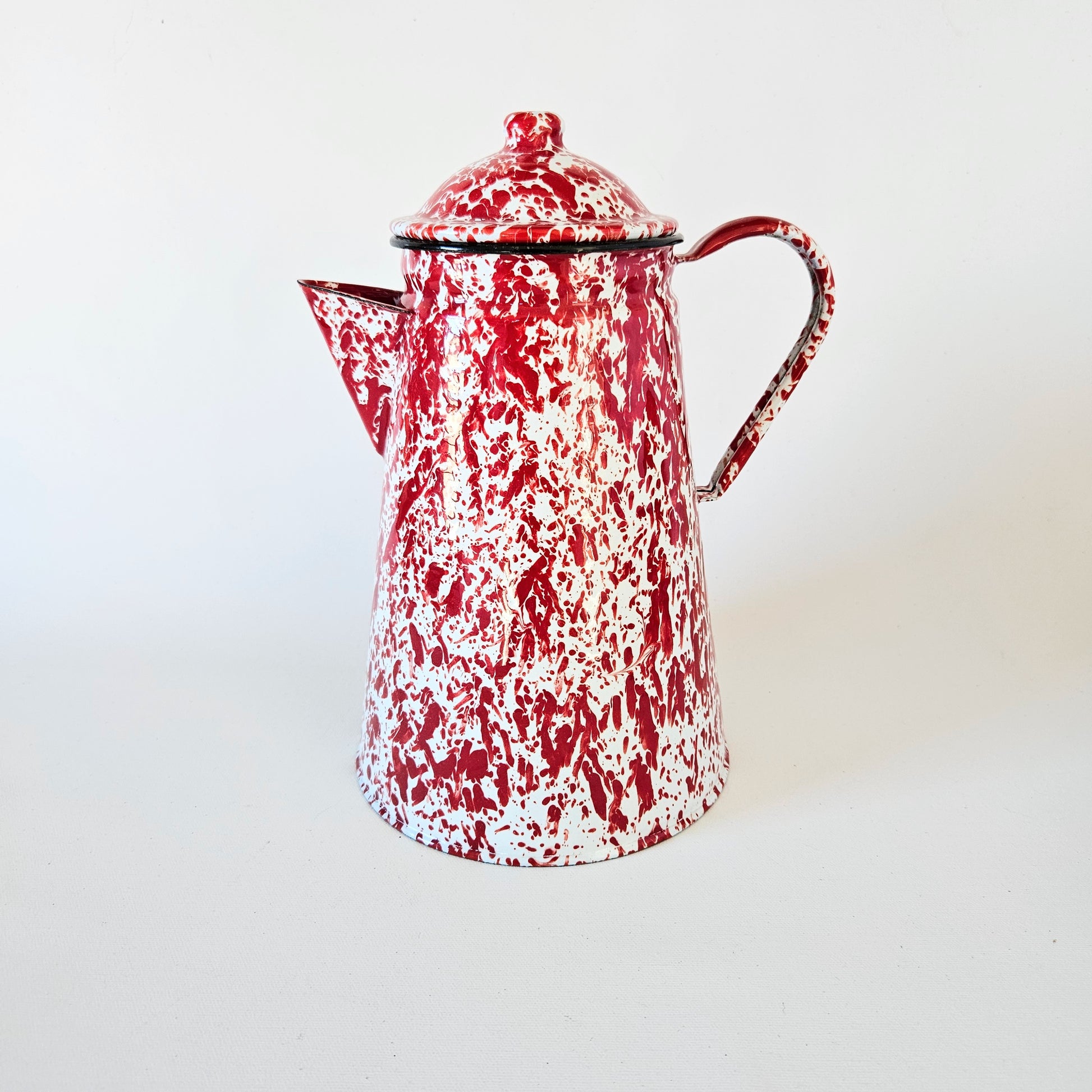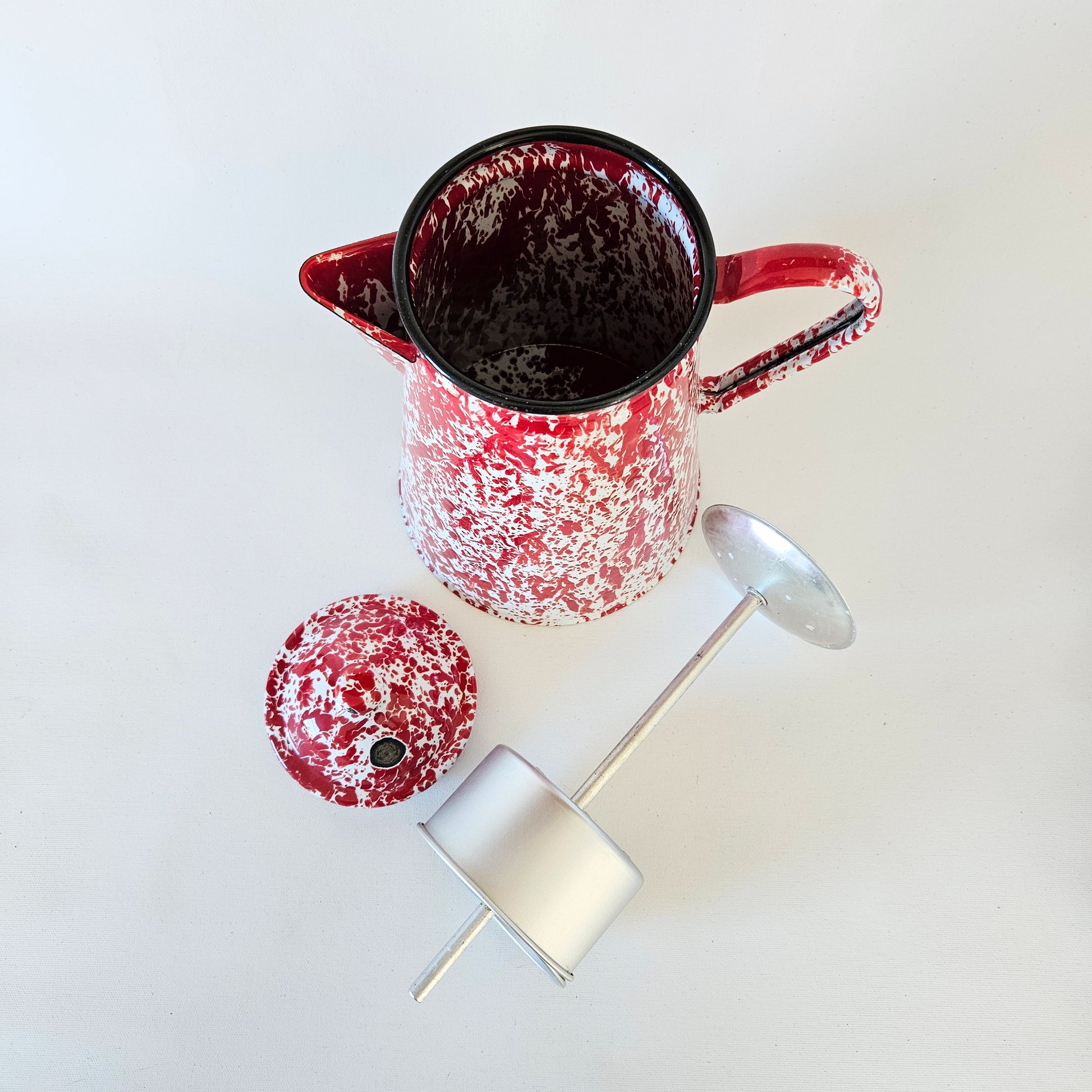 ensemble vintage de pichet cafetière (avec piston en métal) et tasses en métal émaillé rouge et blanc