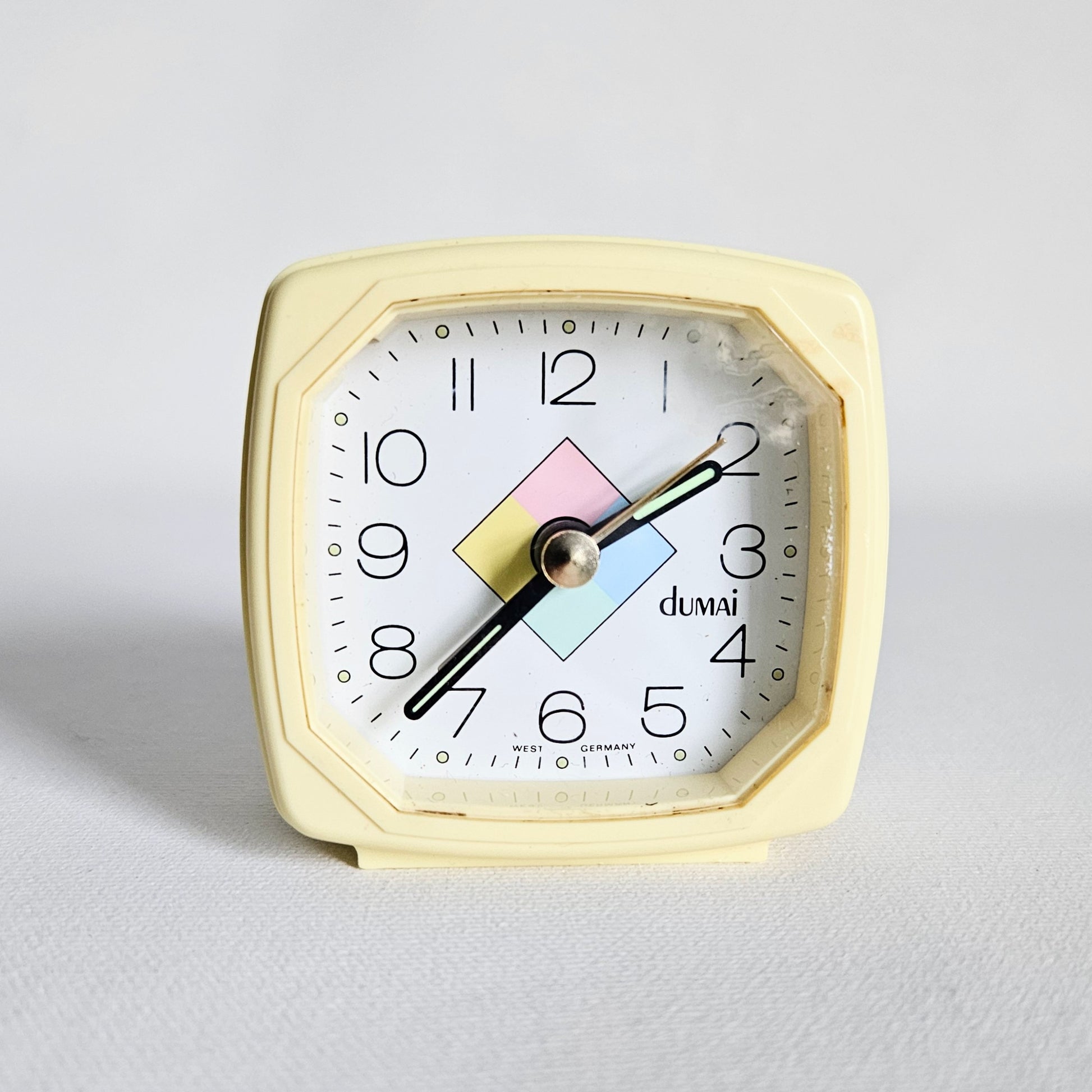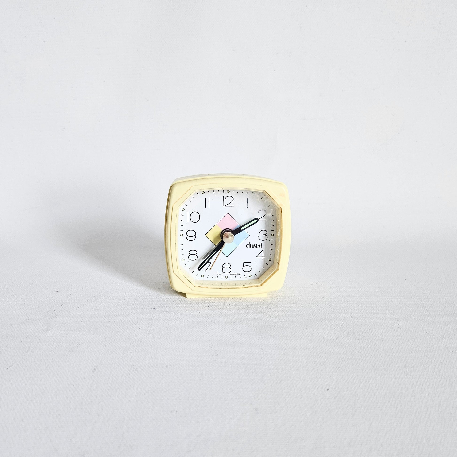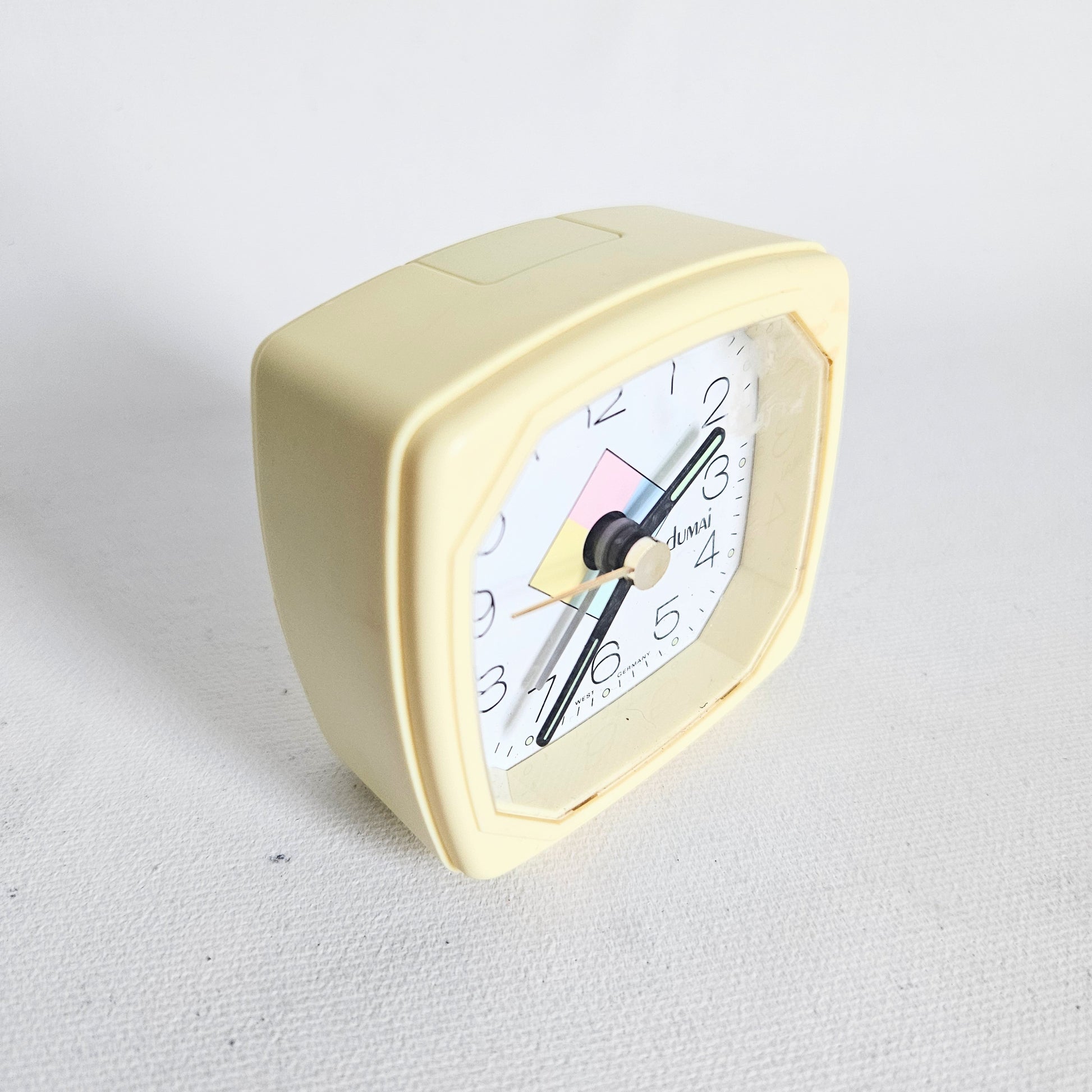 petit réveil-matin (avec alarme fonctionnelle) carré vintage aux couleurs pastel, signé Dumai, fait en Allemagne
