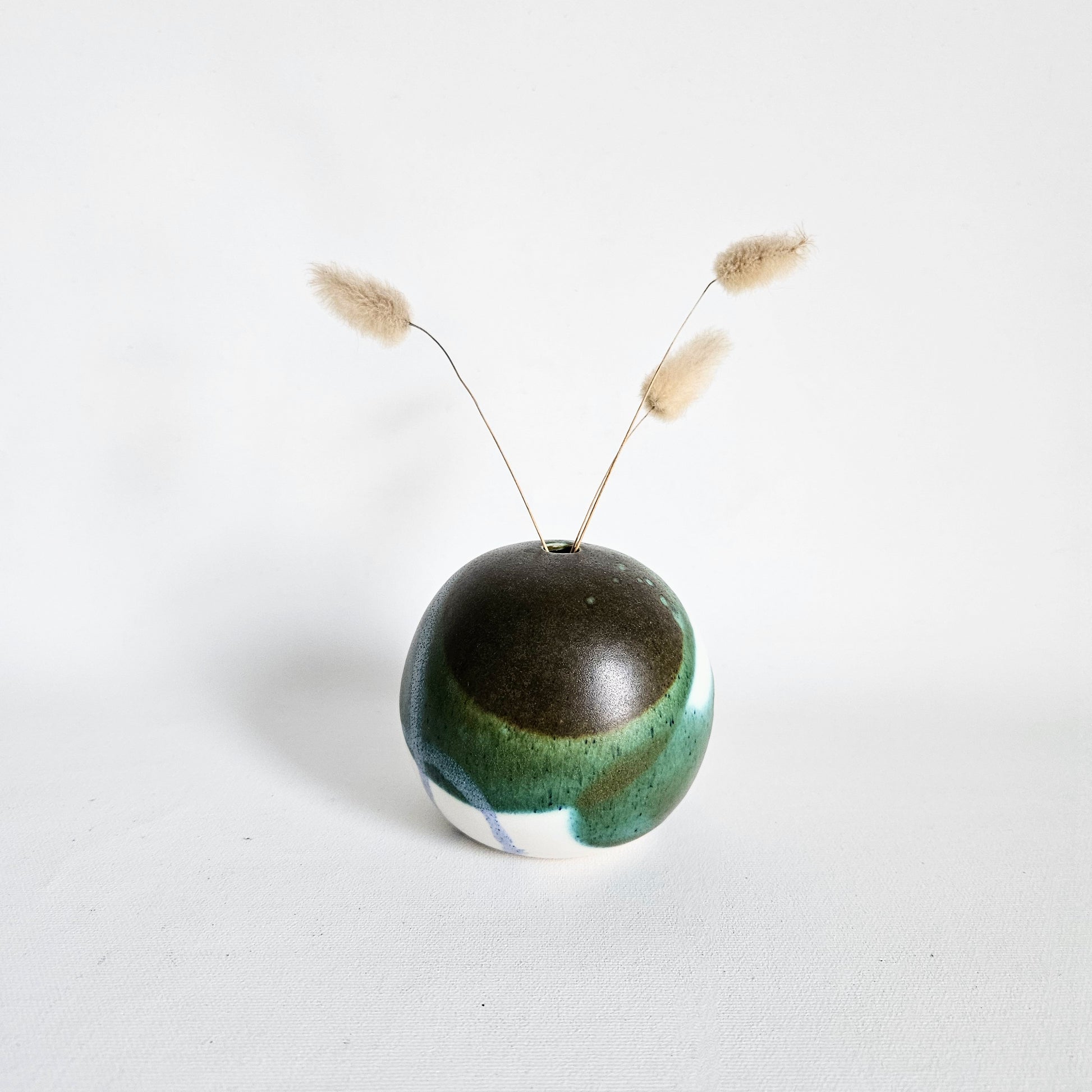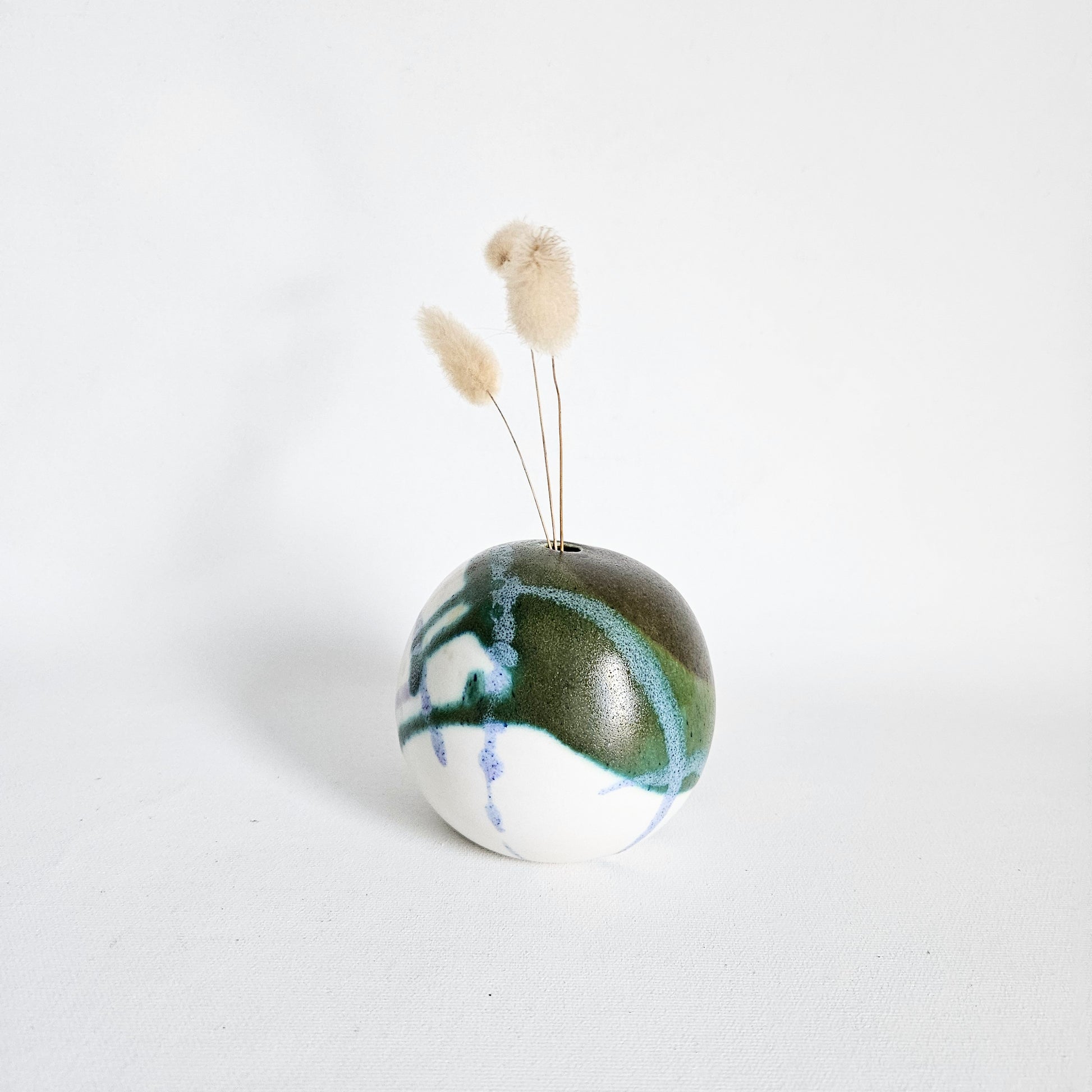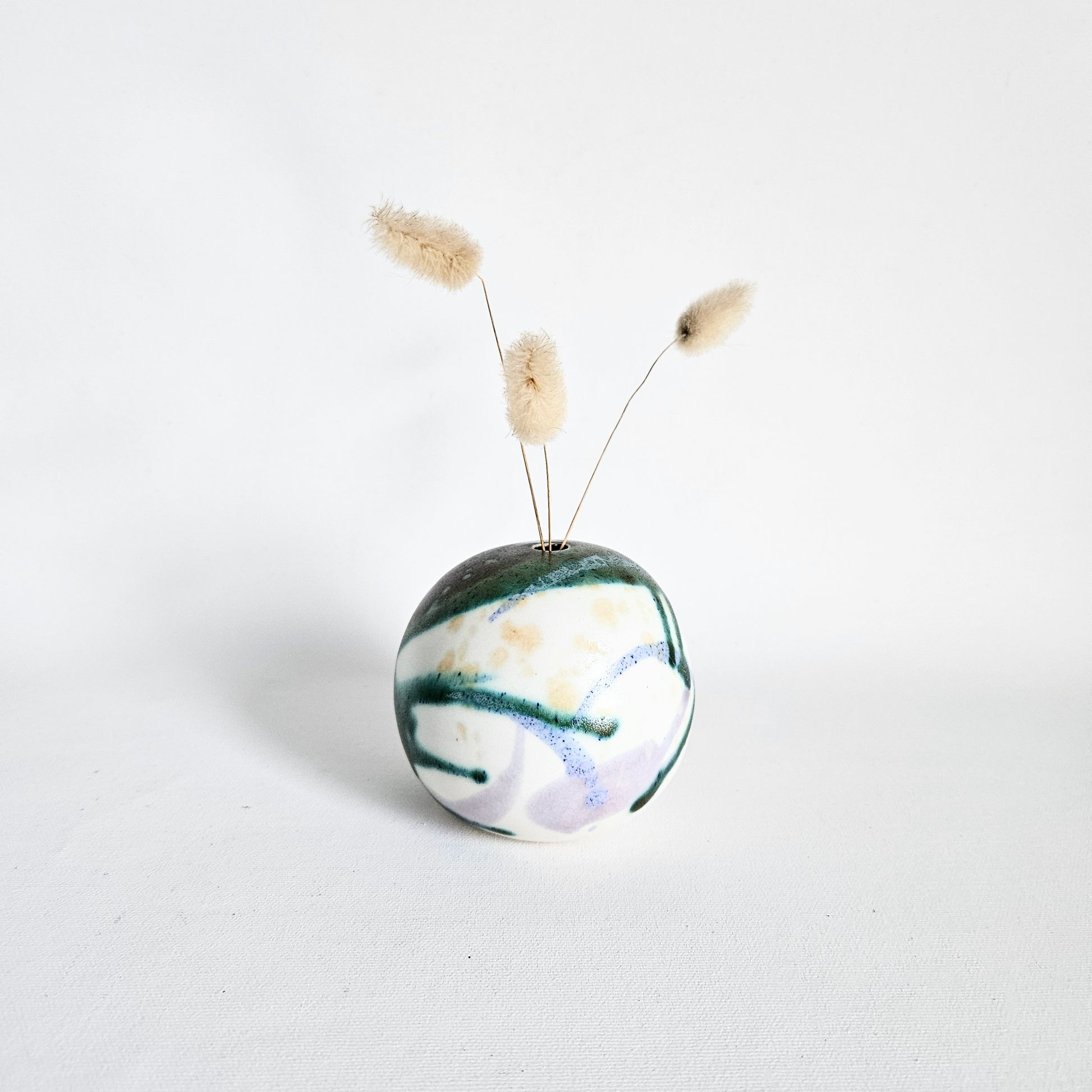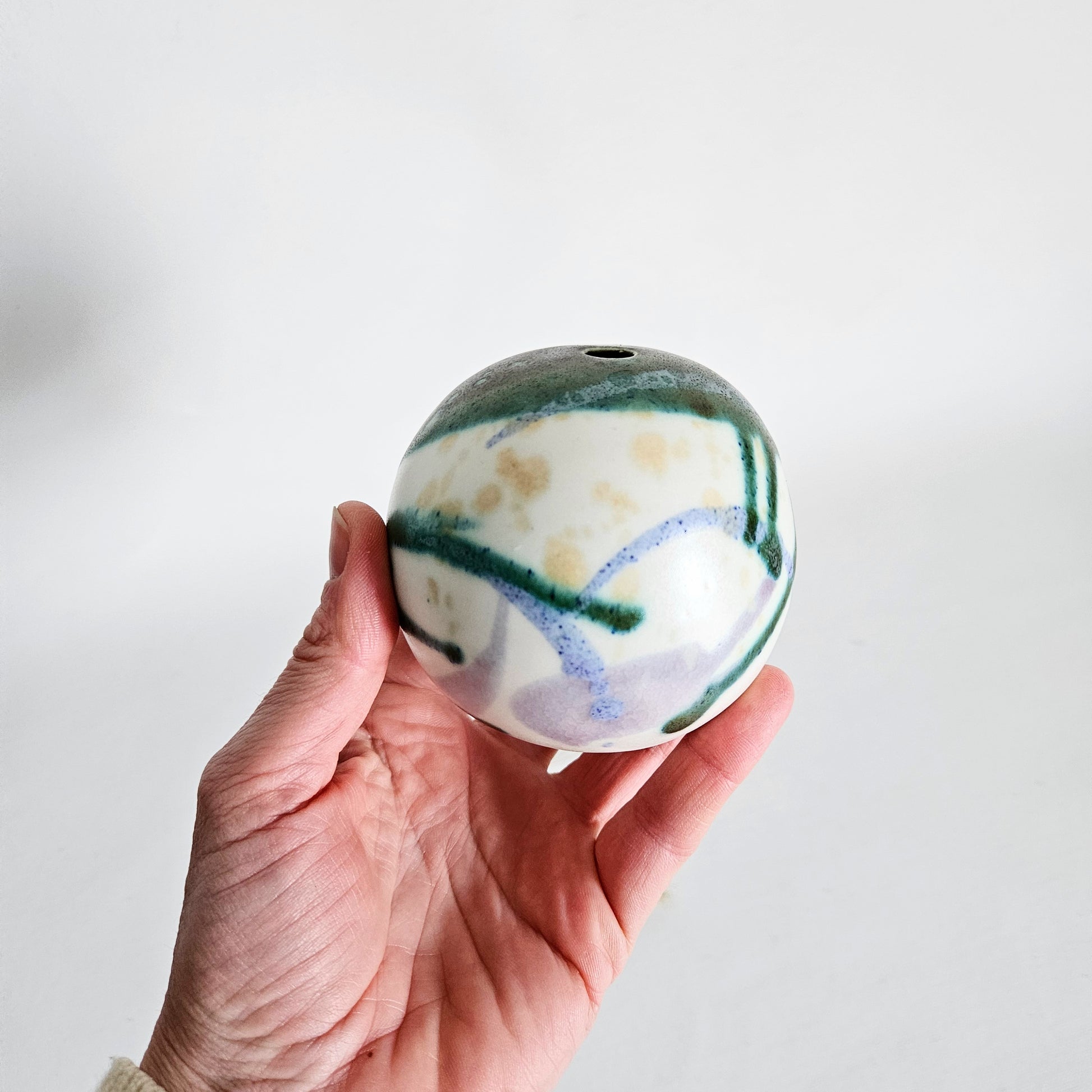 petit soliflore vintage 1970s, boule en céramique multicolore (vert, beige, mauve), signé Helga Mader, fait à la main au Québec