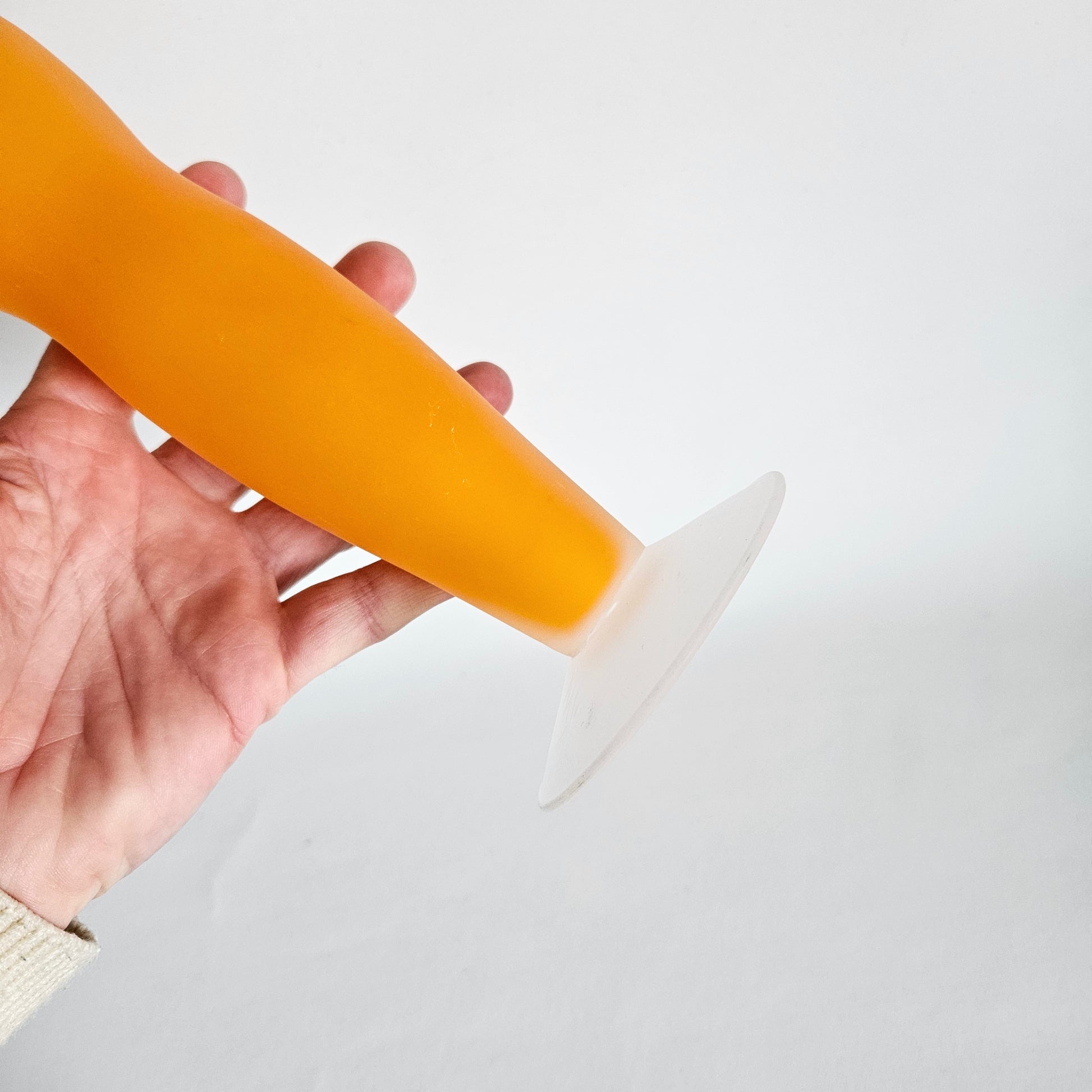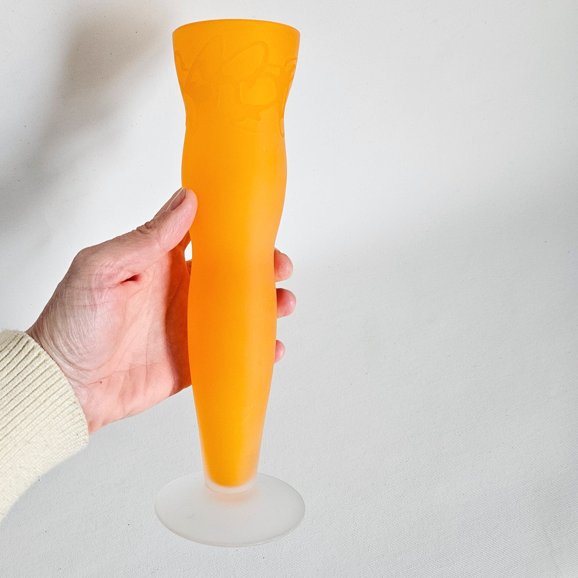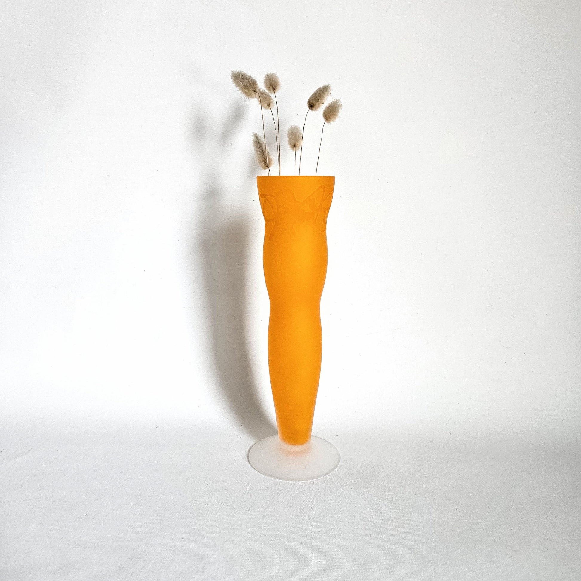 grand soliflore vintage en verre soufflé givré/dépoli orange et pied clair