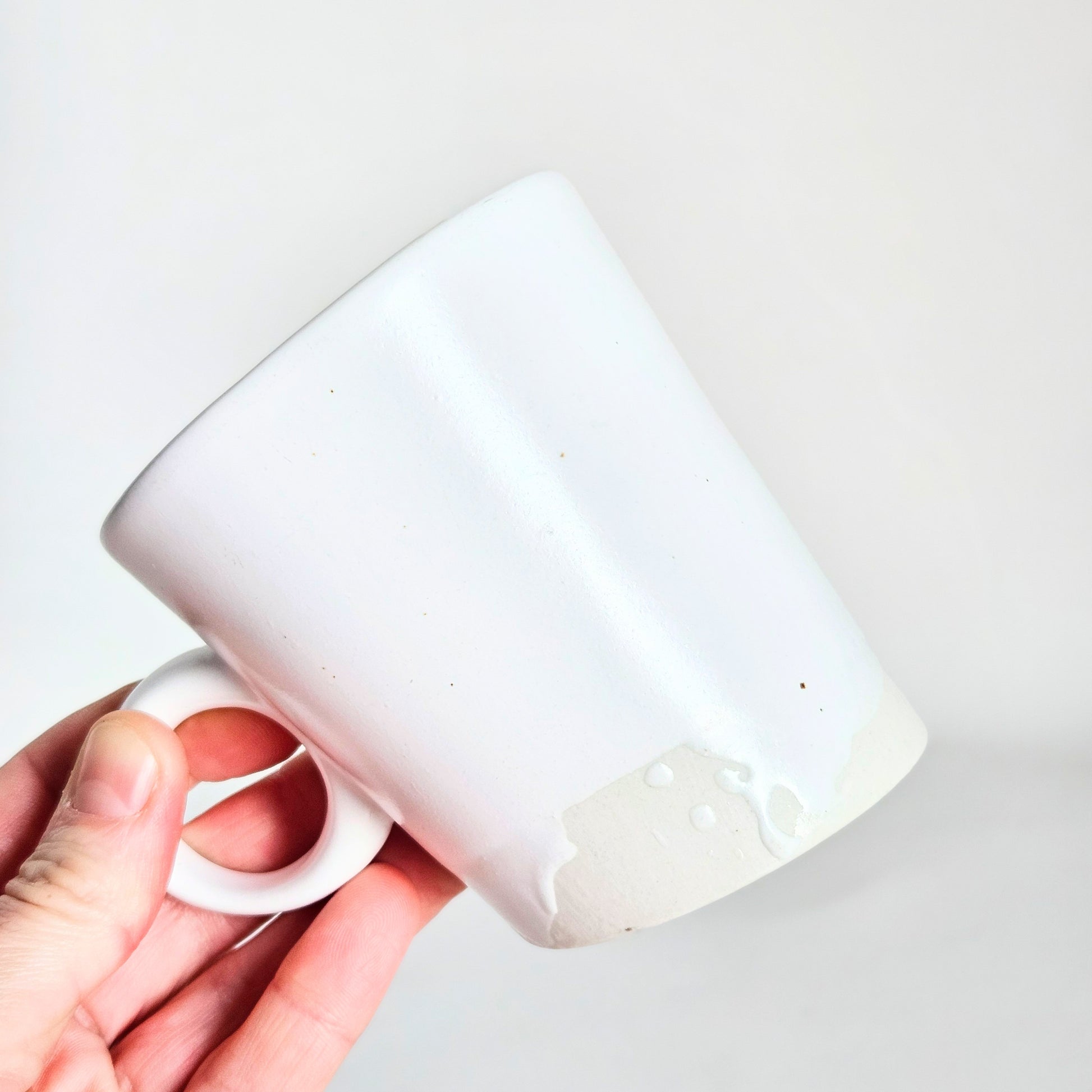 tasse seconde main en céramique artisanale blanc cassé, forme penchée