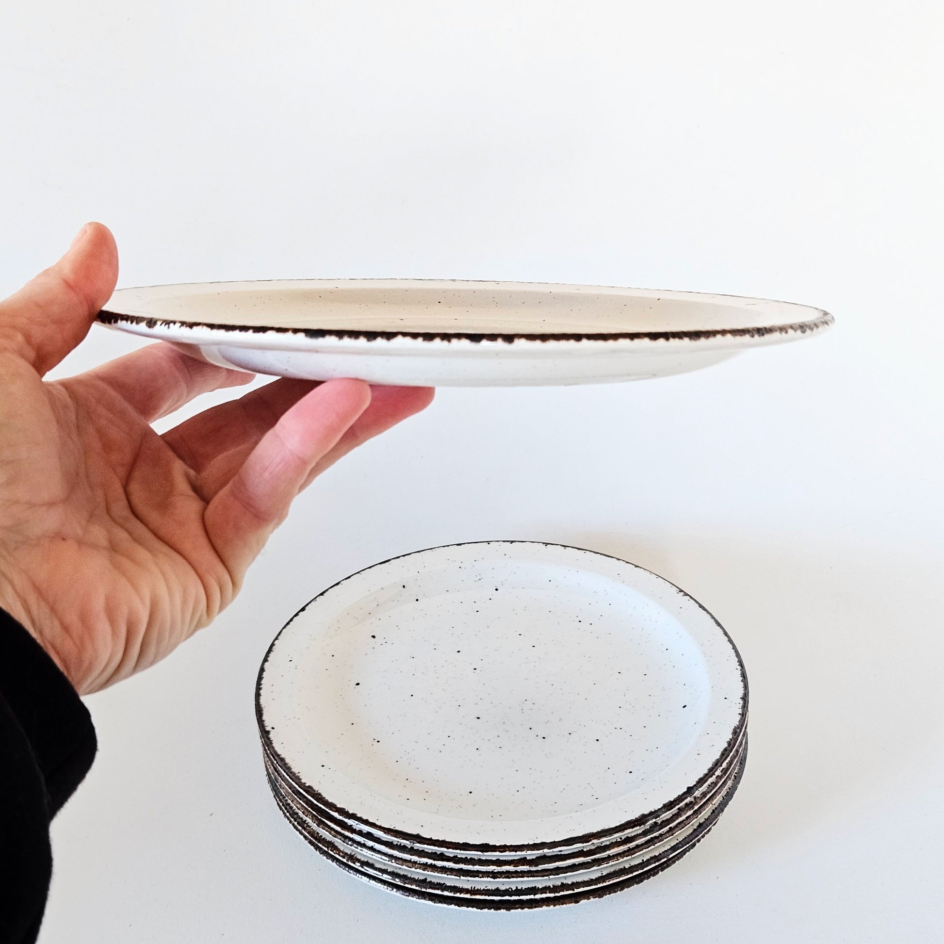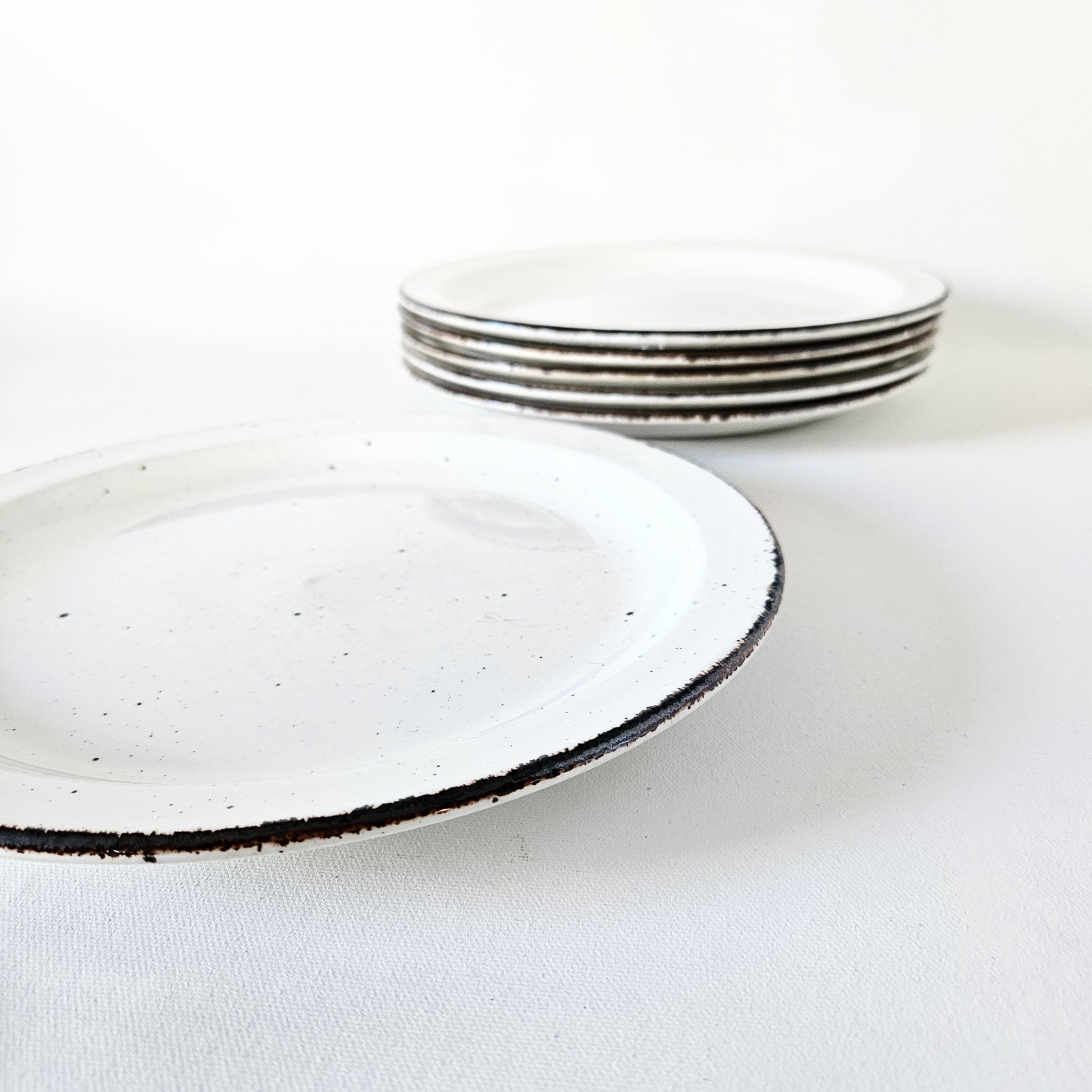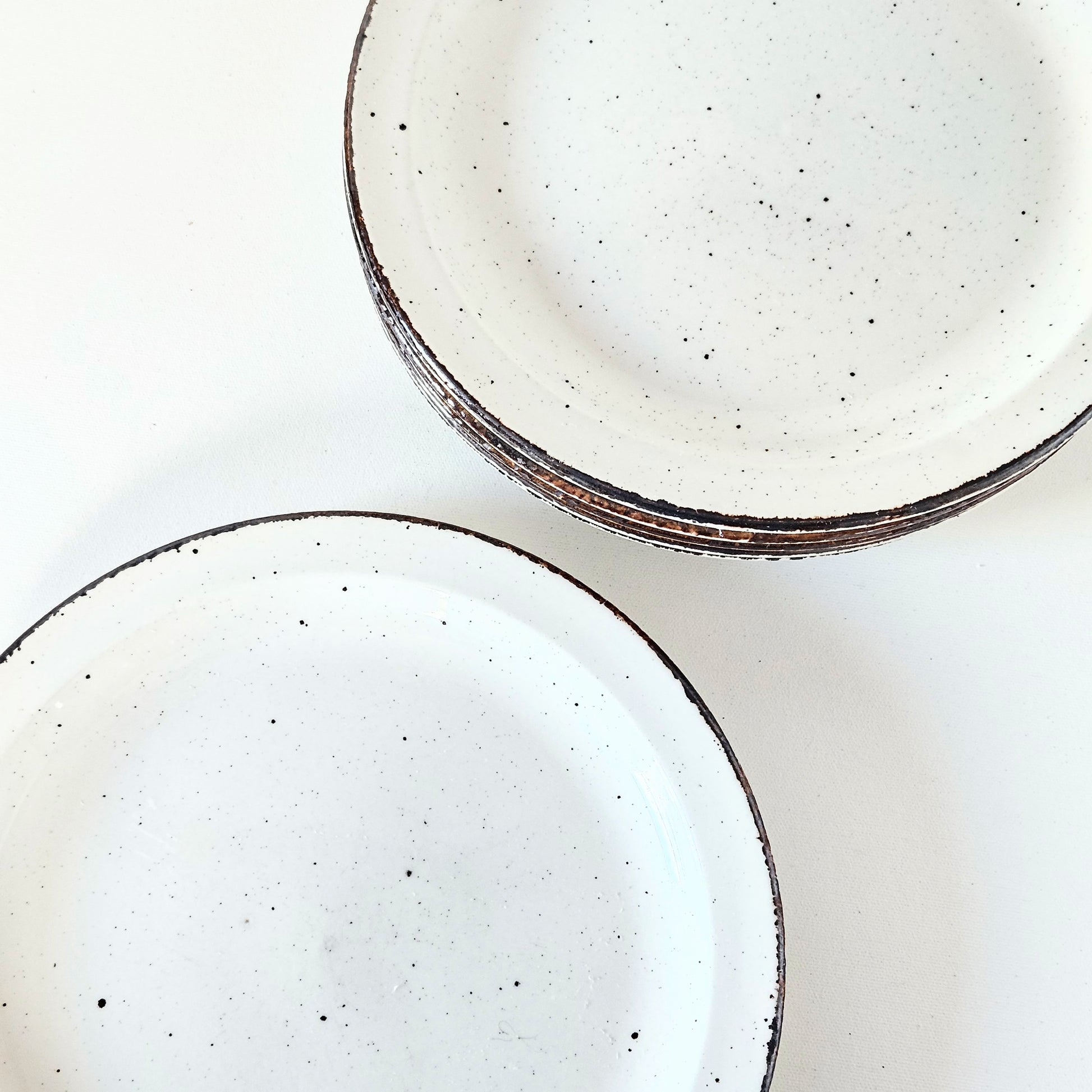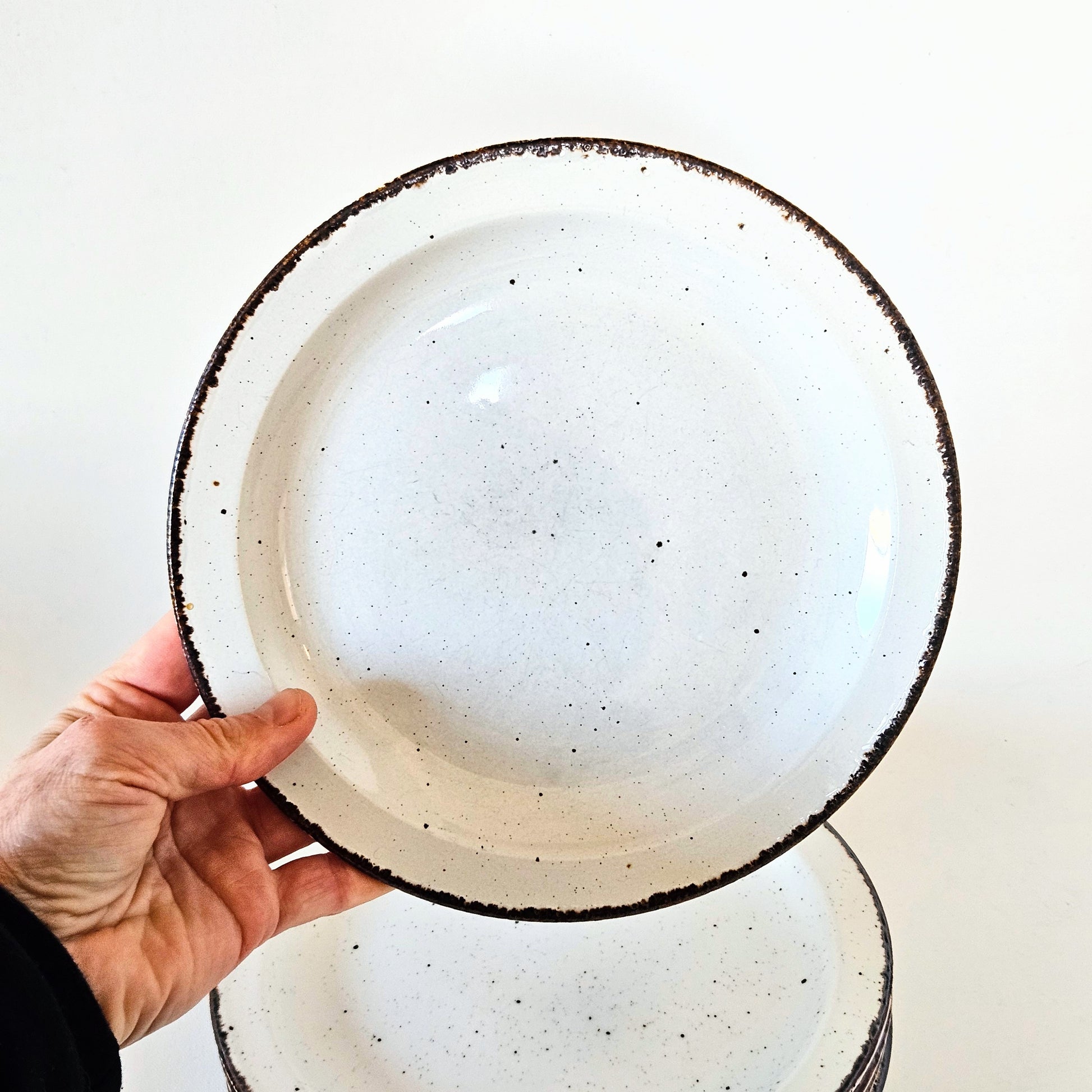 ensemble de vaisselle (grande assiettes, assiettes à dessert et assiettes crueses/bols) en céramique blanc picoté brun, Stonehenge Midwinter, faite en Angleterre. Compatibles avec le micro-ondes et lave-vaisselle