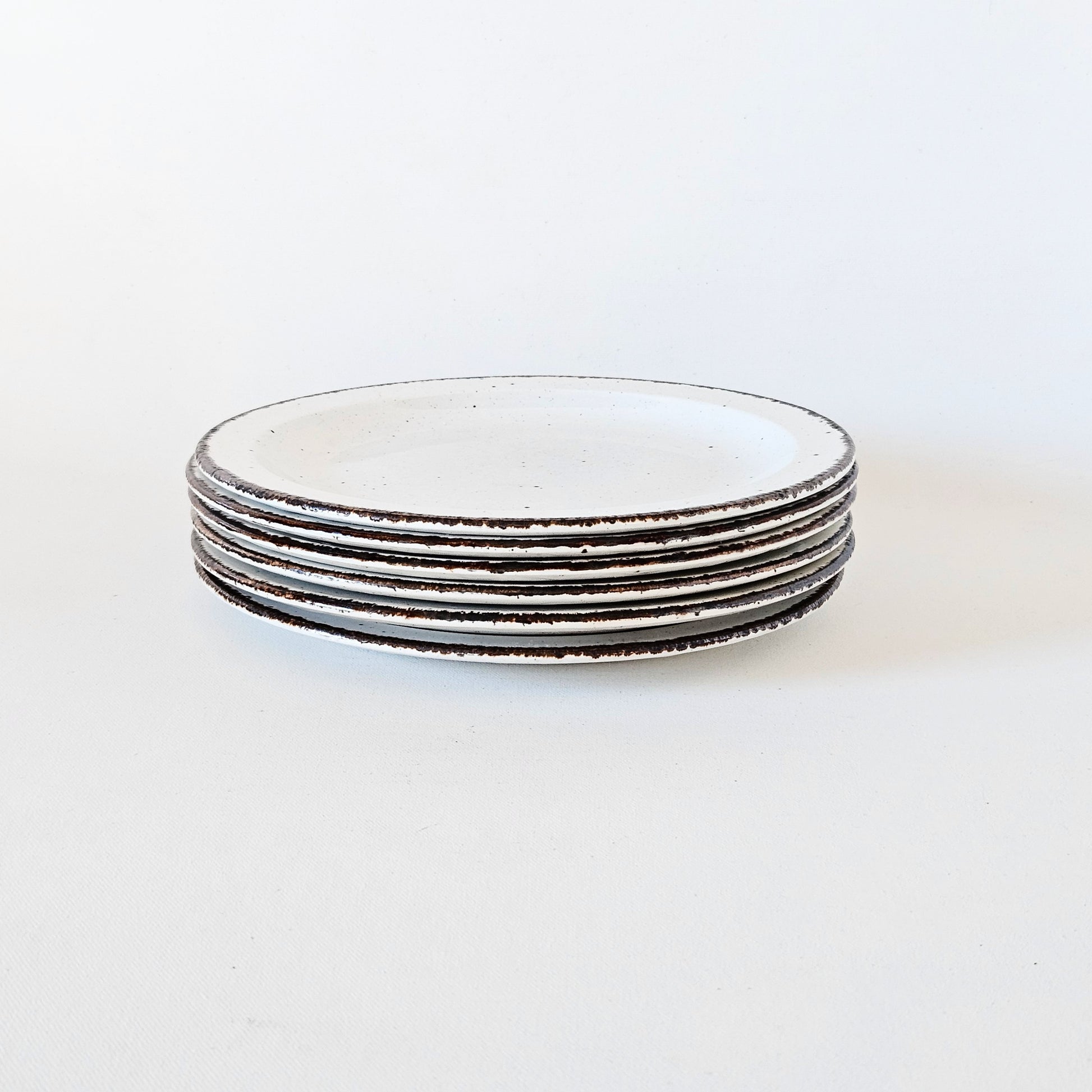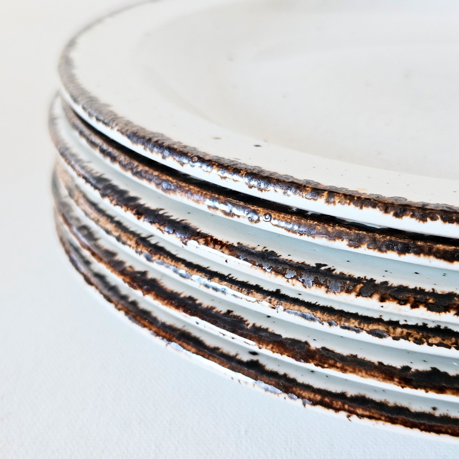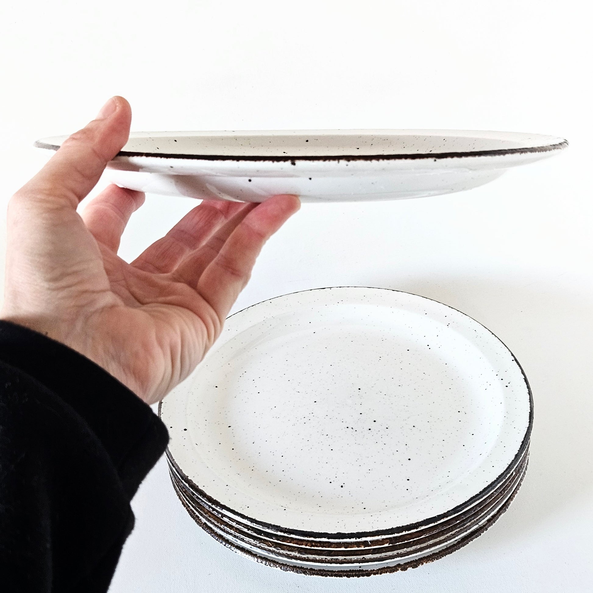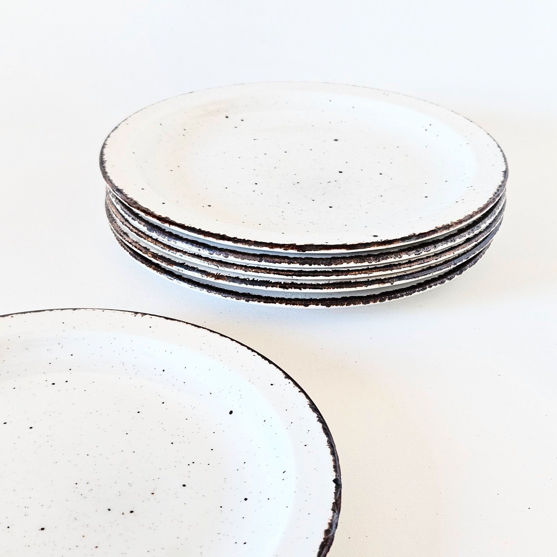 ensemble de vaisselle (grande assiettes, assiettes à dessert et assiettes crueses/bols) en céramique blanc picoté brun, Stonehenge Midwinter, faite en Angleterre. Compatibles avec le micro-ondes et lave-vaisselle