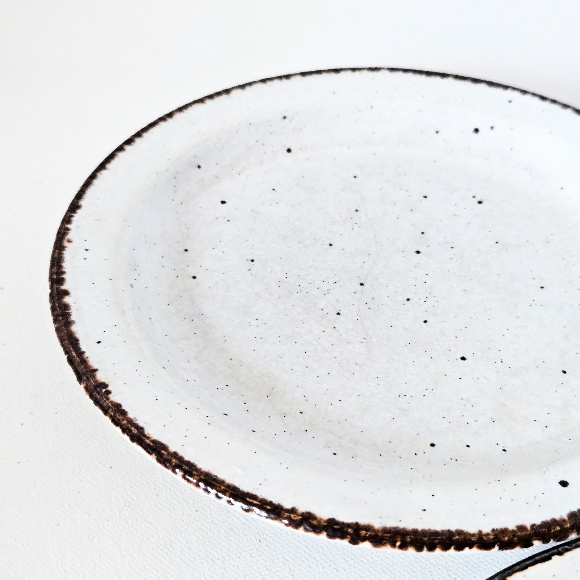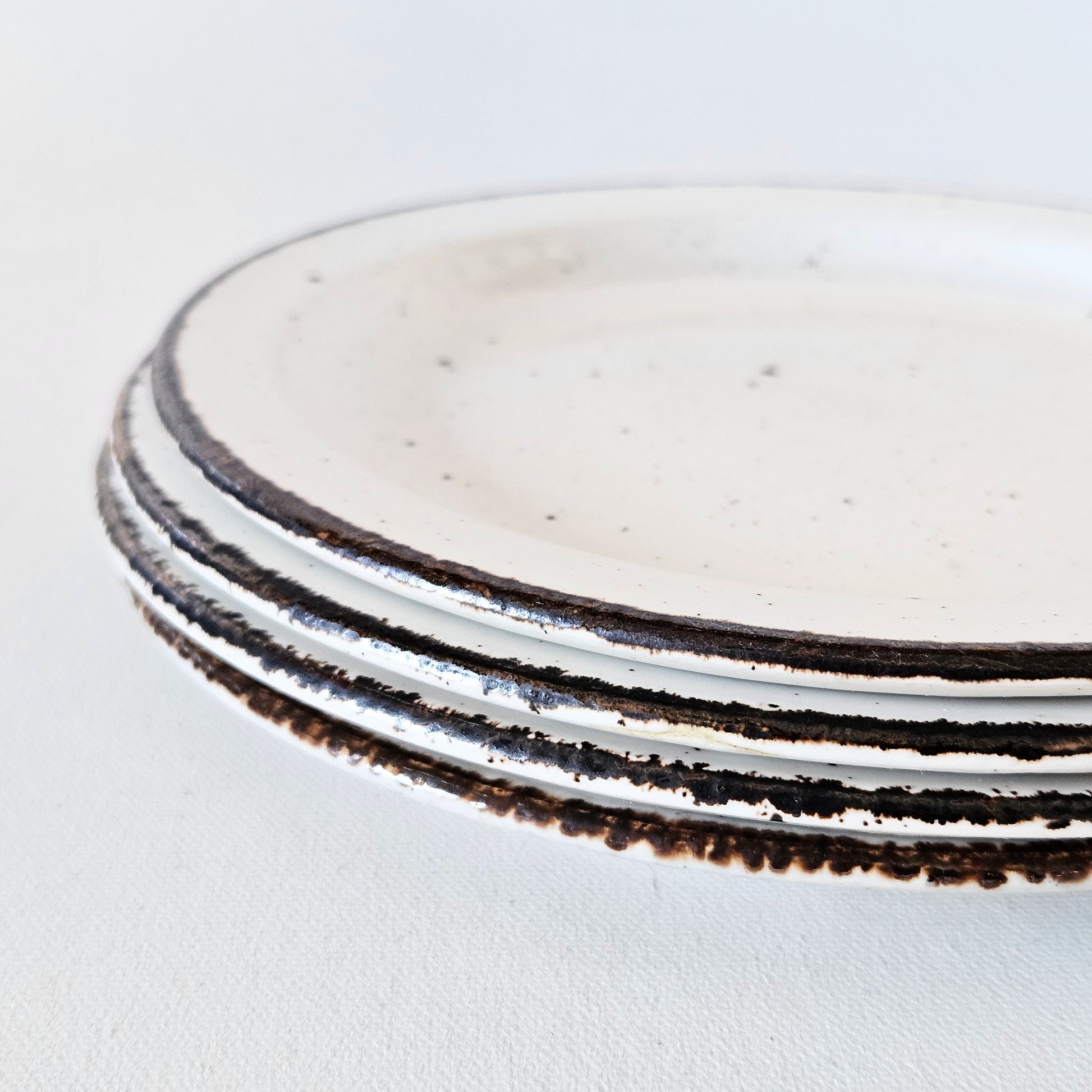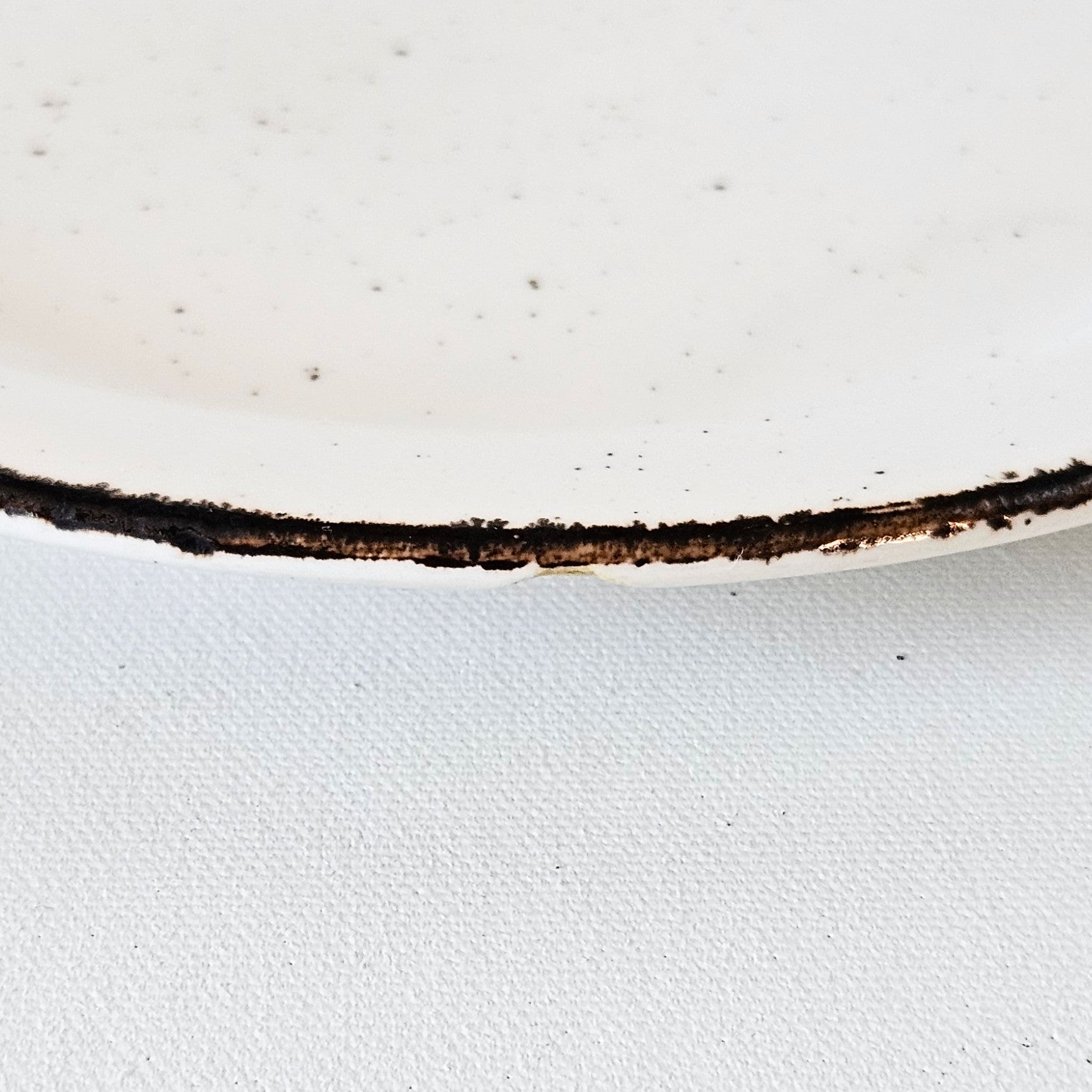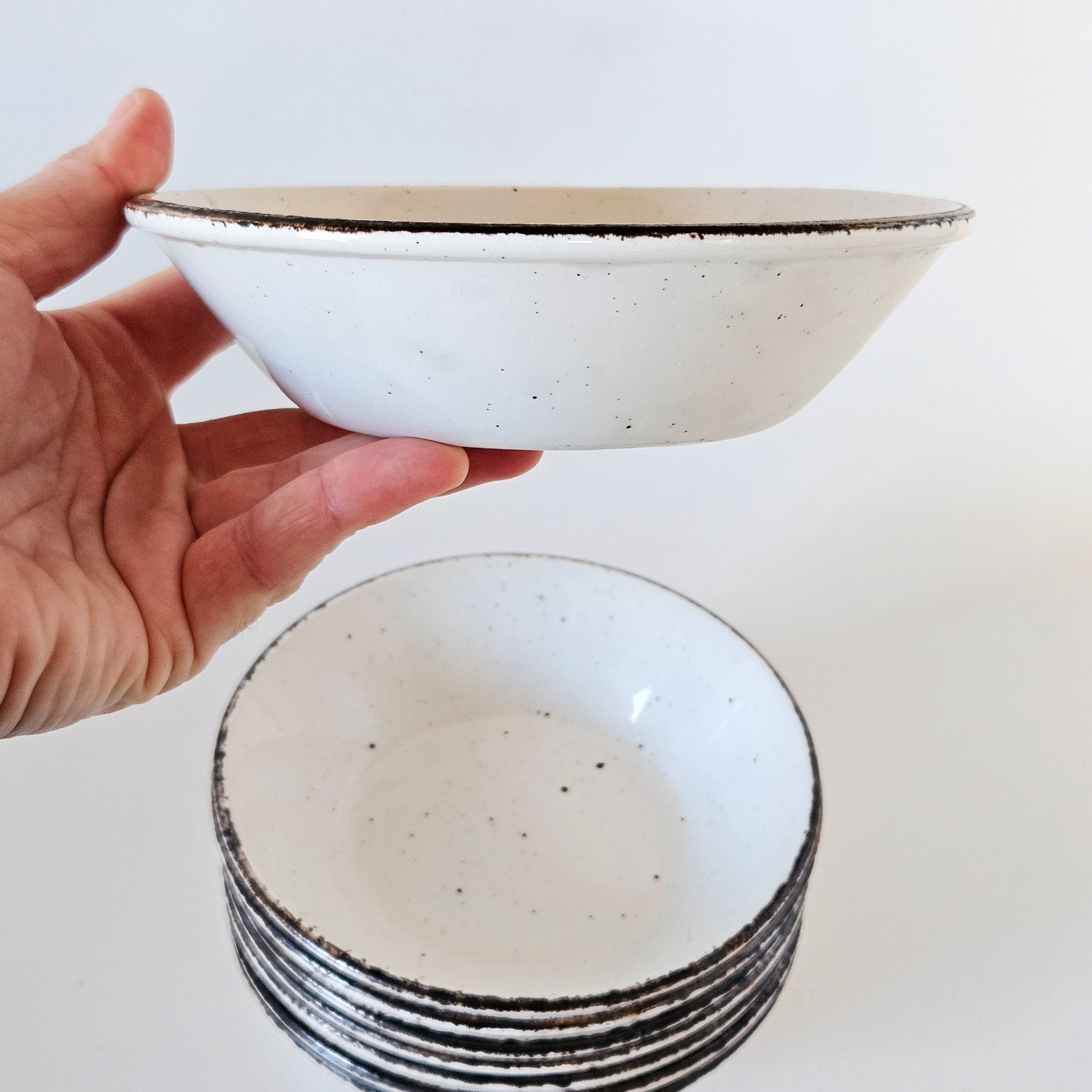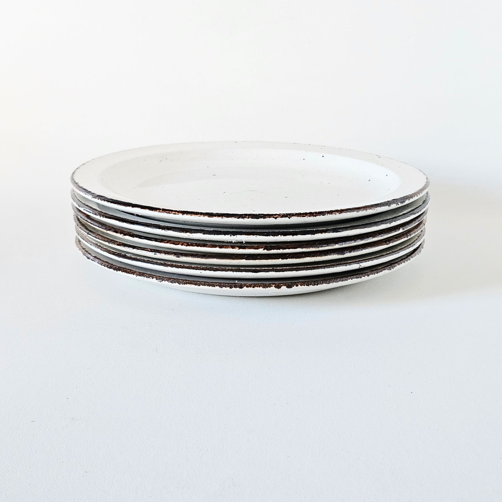 ensemble de vaisselle (grande assiettes, assiettes à dessert et assiettes crueses/bols) en céramique blanc picoté brun, Stonehenge Midwinter, faite en Angleterre. Compatibles avec le micro-ondes et lave-vaisselle