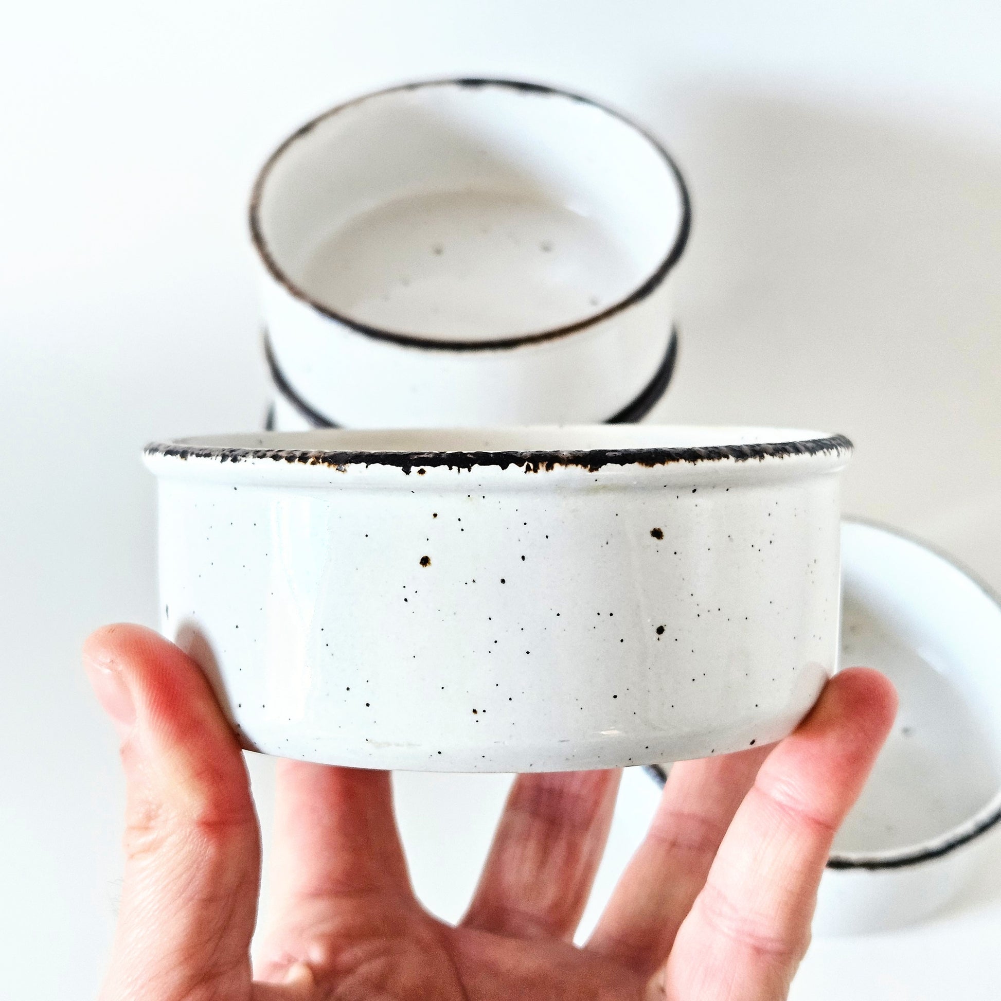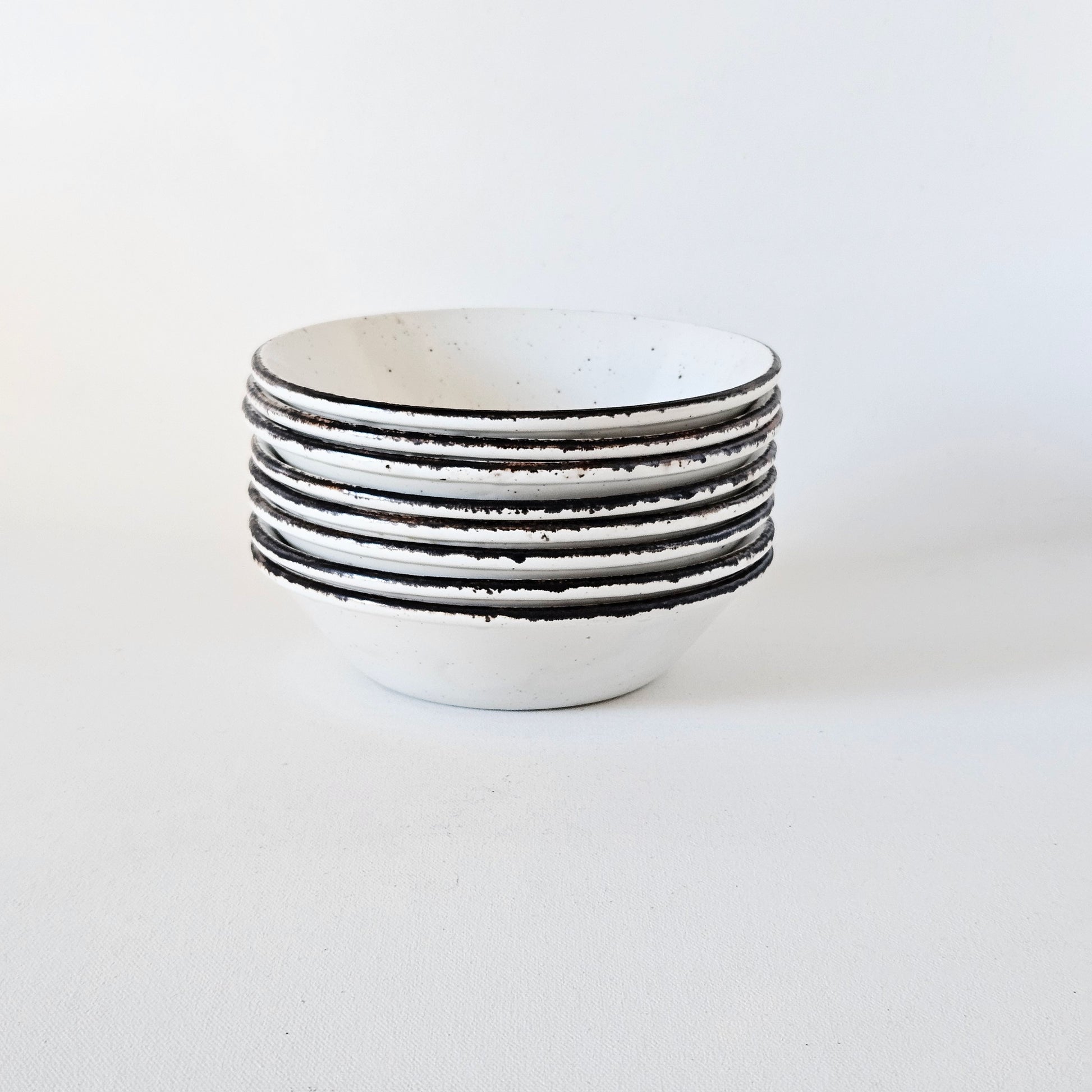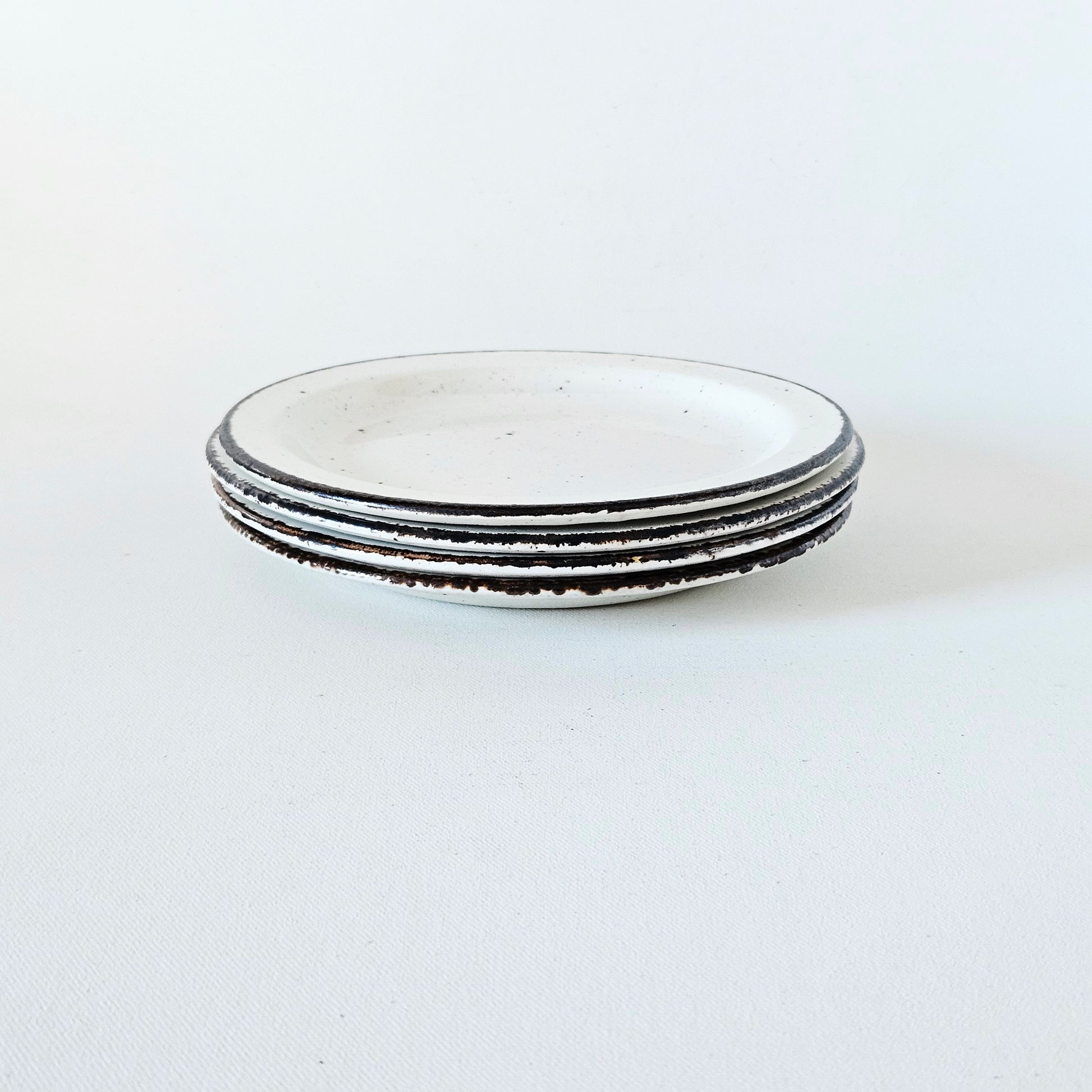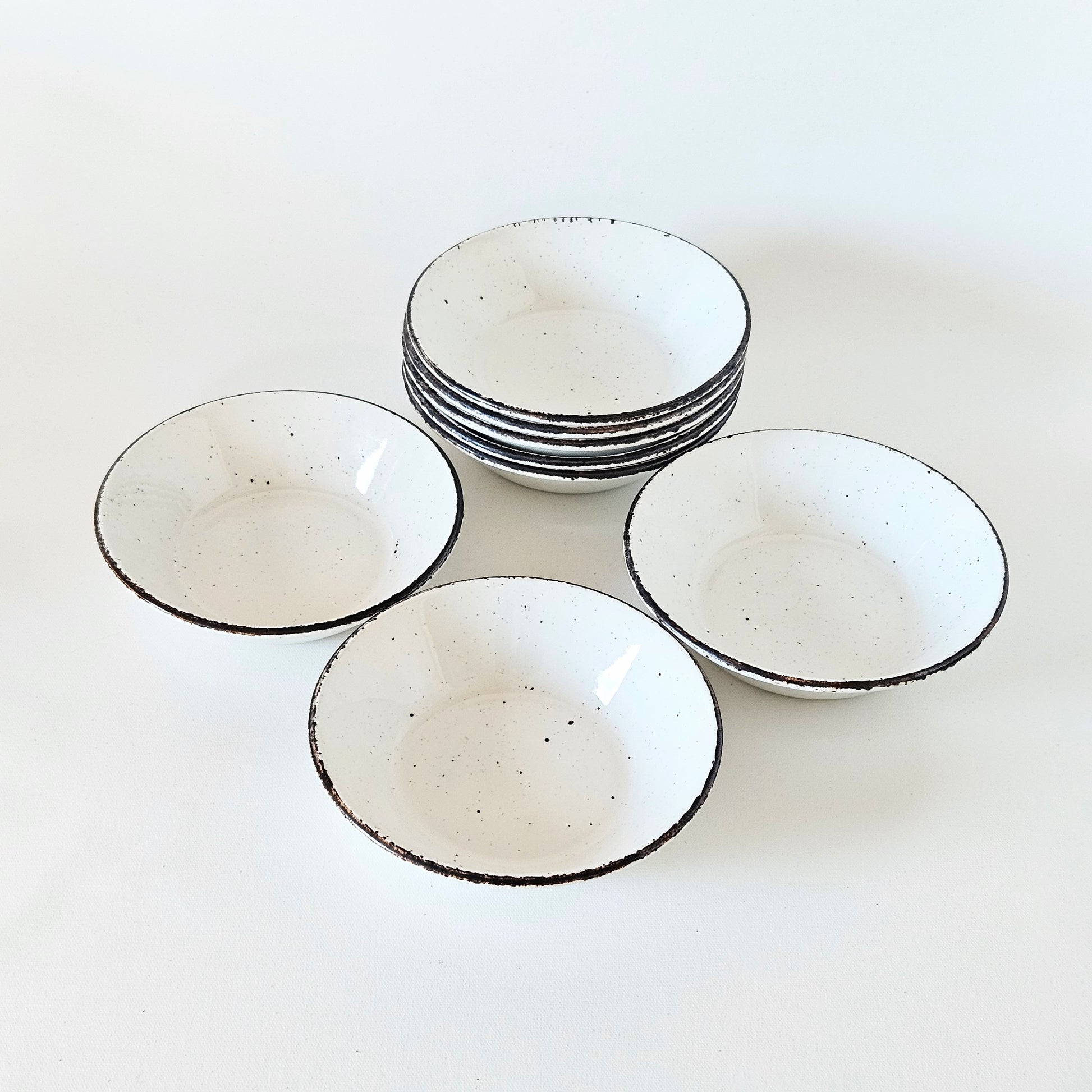 ensemble de vaisselle (grande assiettes, assiettes à dessert et assiettes crueses/bols) en céramique blanc picoté brun, Stonehenge Midwinter, faite en Angleterre. Compatibles avec le micro-ondes et lave-vaisselle