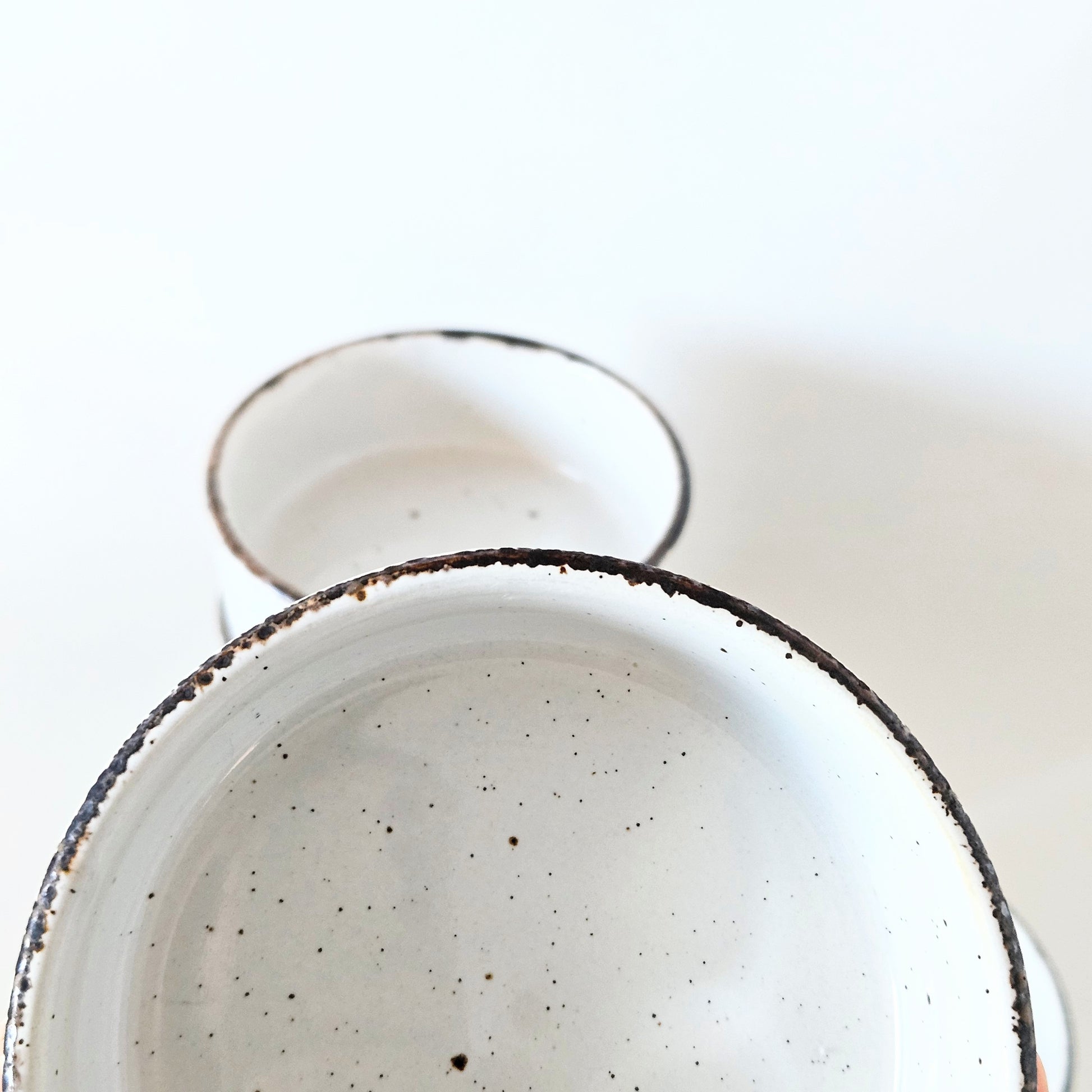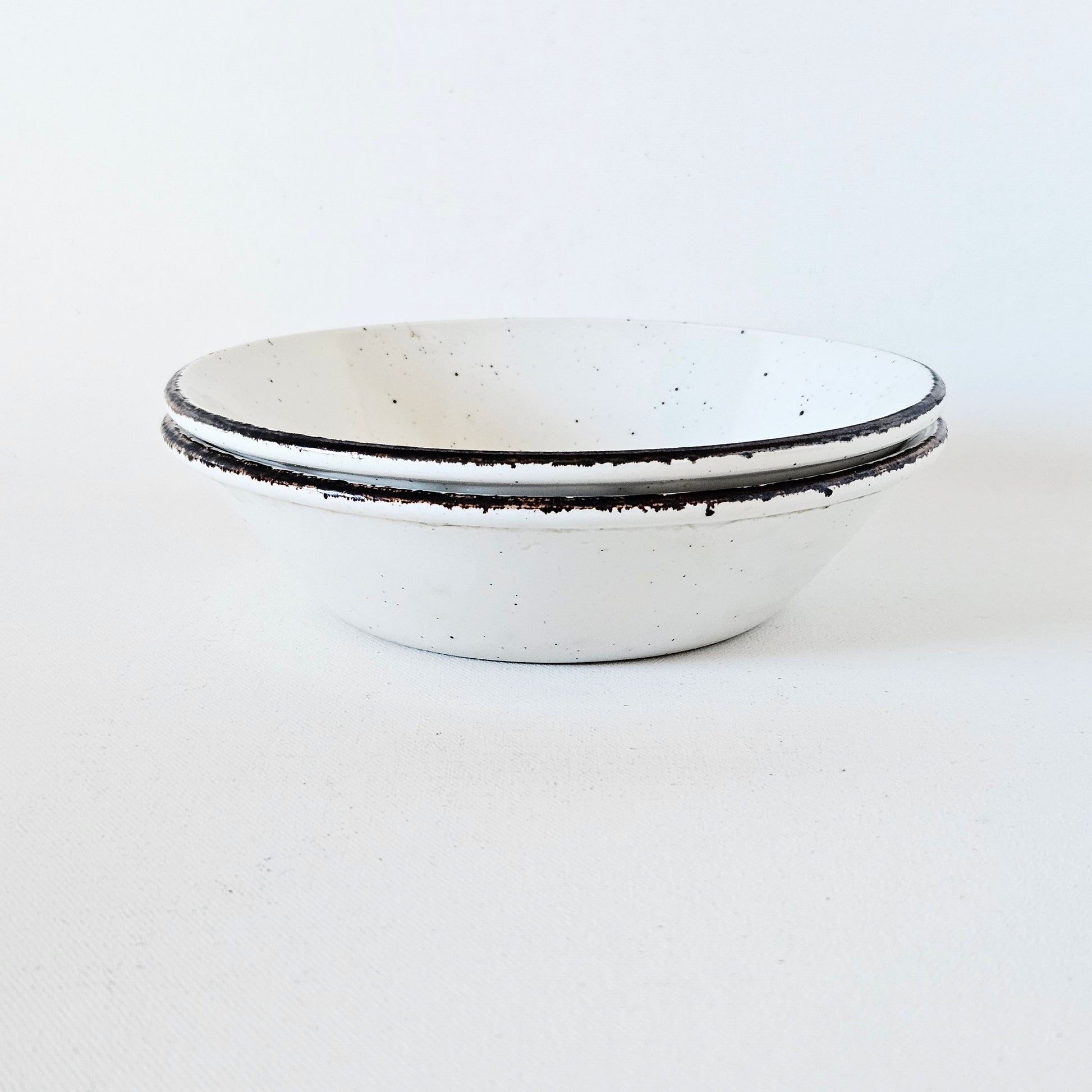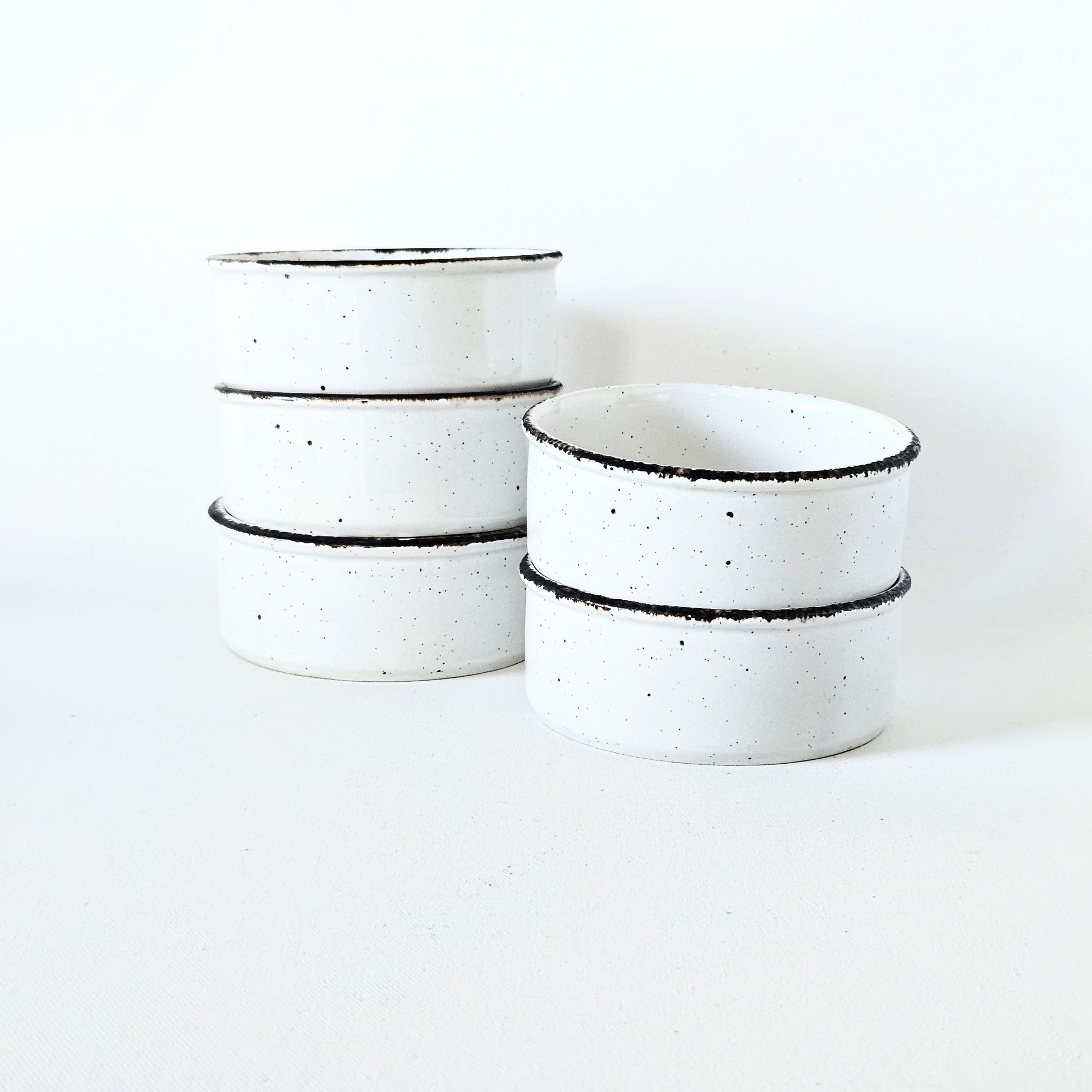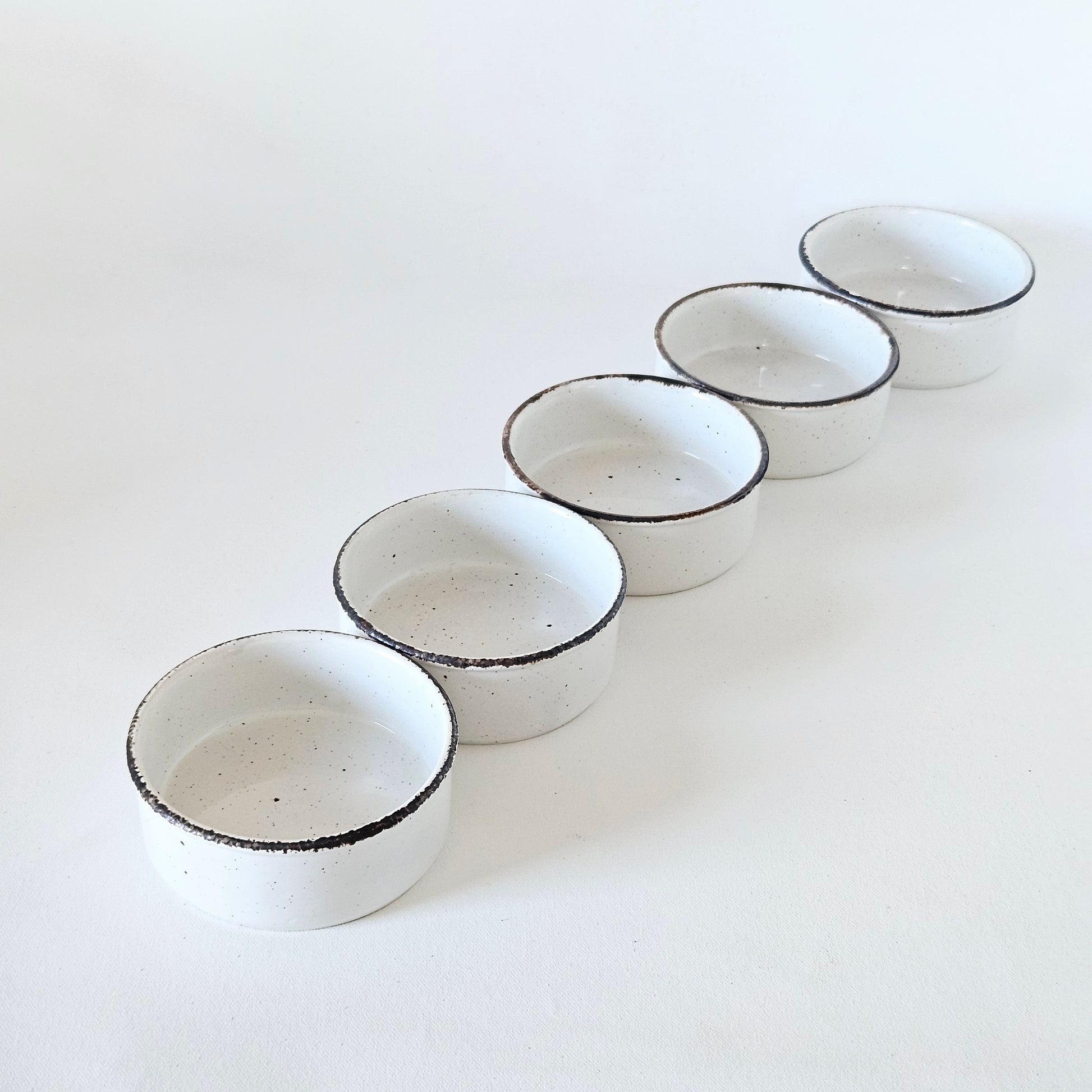 ensemble de vaisselle (grande assiettes, assiettes à dessert et assiettes crueses/bols) en céramique blanc picoté brun, Stonehenge Midwinter, faite en Angleterre. Compatibles avec le micro-ondes et lave-vaisselle