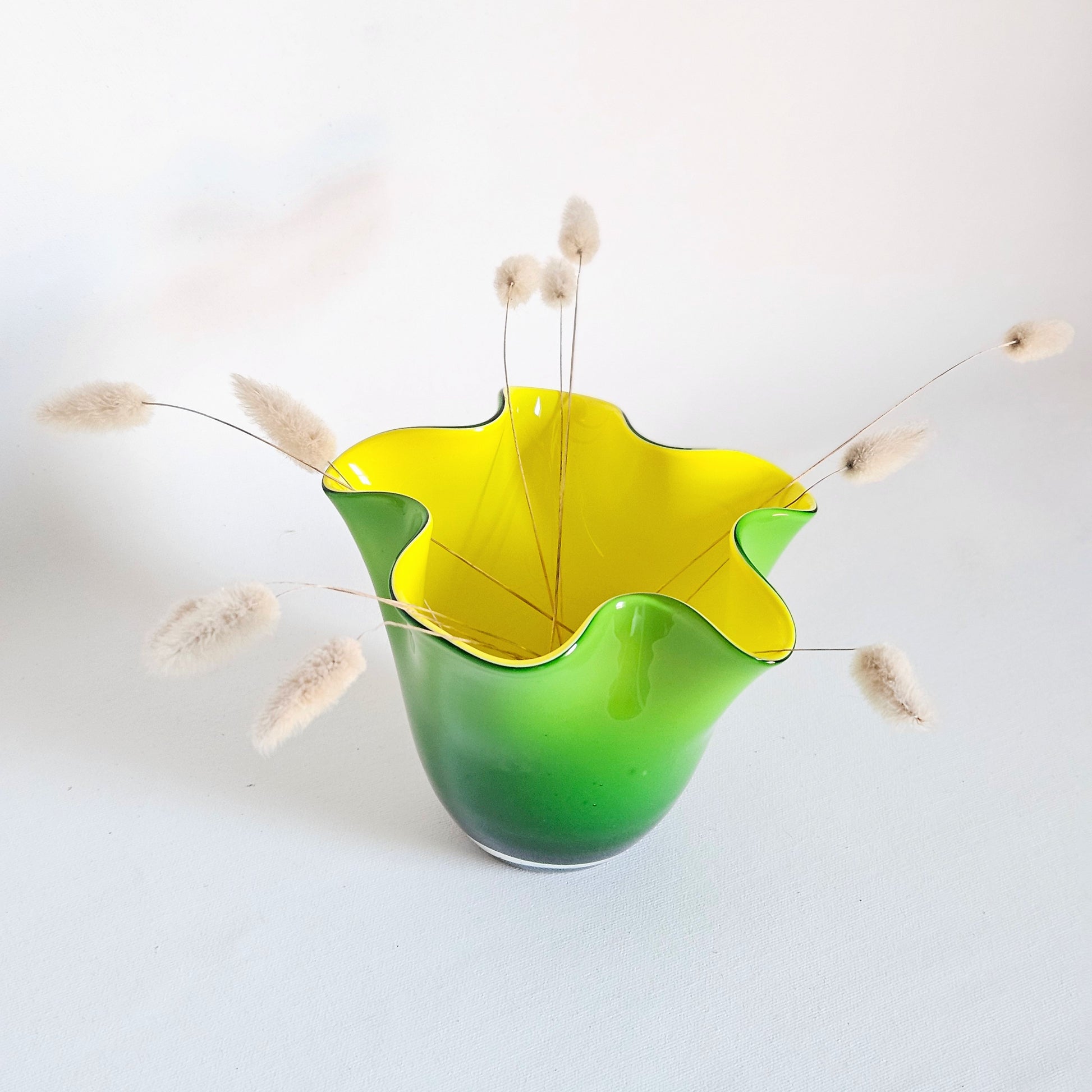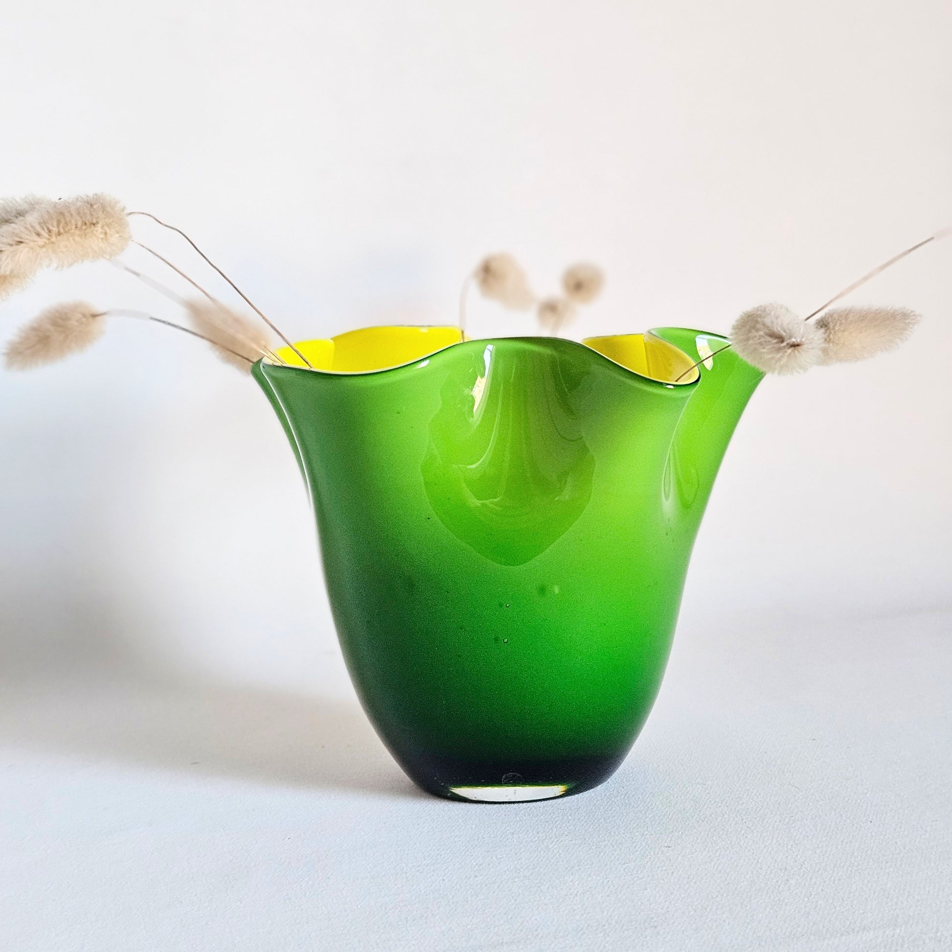vase vintage en verre bicolore à bord ondulé, intérieur jaune, extérieur vert