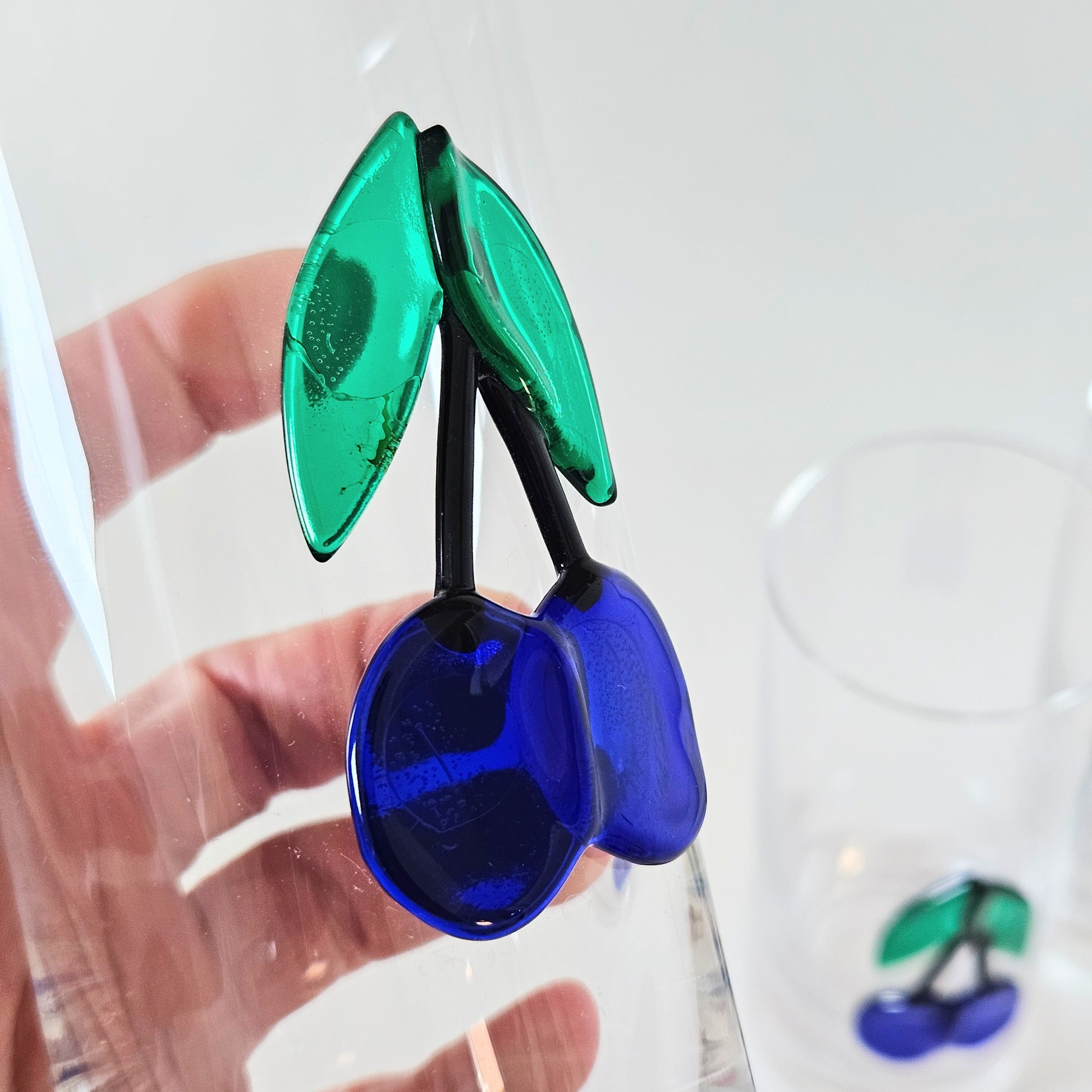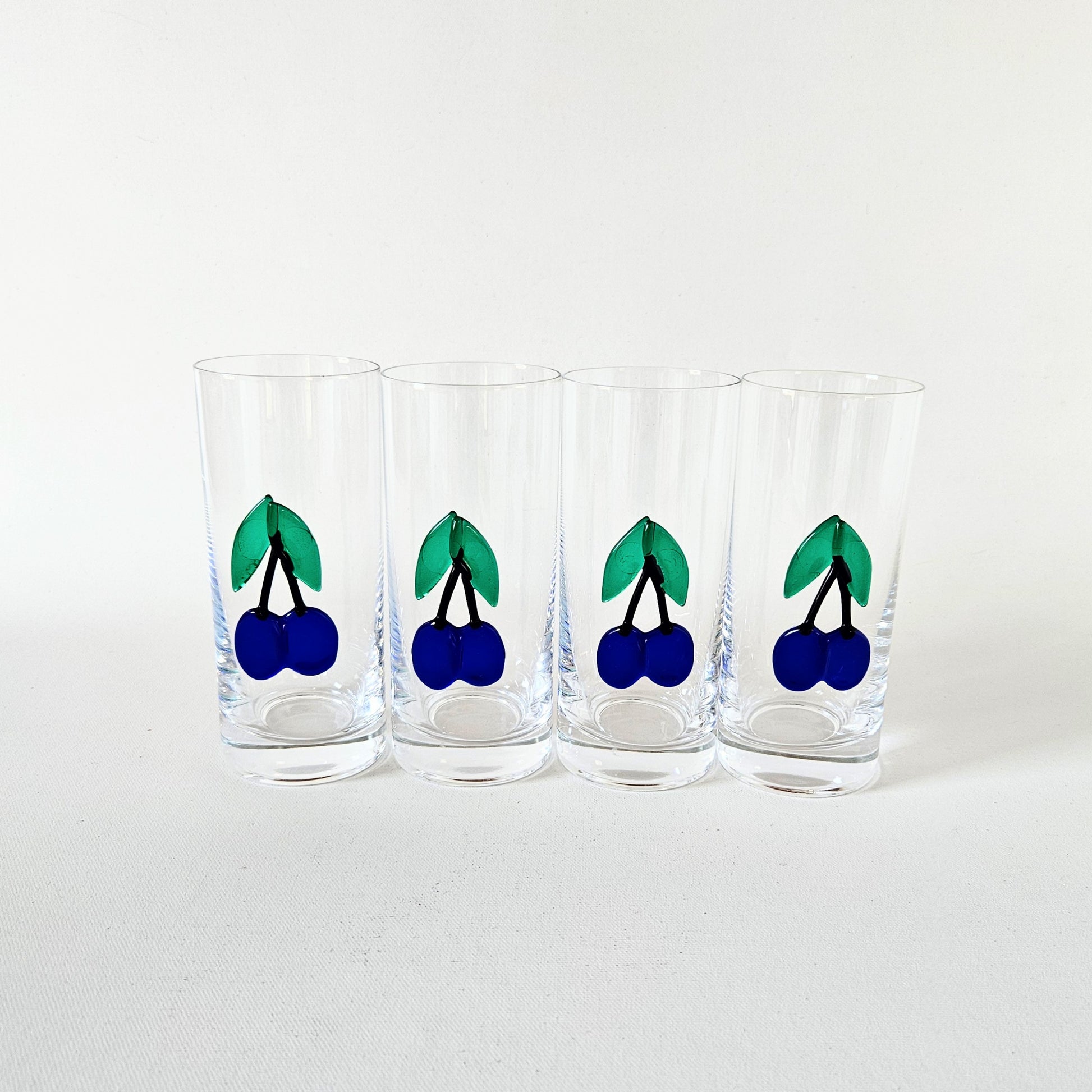 ensemble de 4 verres high ball en cristal (probablement) et motifs Cerises en verre soufflé vert et bleu